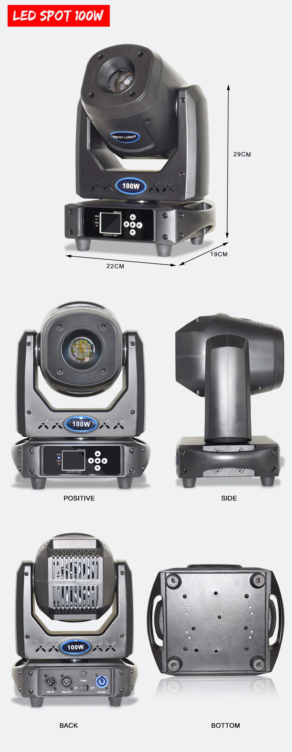 Особенности.• Высокая мощность 100 Вт Светодиодный прожектор с моторизованным зумом• Угол луча: 12 ~ 18 градусов угол луча• 3 режима работы: звук активный, режим показа и DMX контроль• 4 встроенных освещения• Электронное Затемнение: 0% - 100%• Электронный Стробоскоп/импульсный эффект; Случайный стробоскоп медленного до быстрого• 5 кривых затемнения• Обратный режим панорамирования/наклона для контрастного движения, когда приспособления соединены между собой• Быстрое движение наклона панорамирования• Эффект дрожания Gobo• 5 фасетных вращающихся призмовых эффектов• 16-уровневая Fine Pan/Tilt контрольный• Шаговые двигатели с микрошаговым механизмом• 3-контактный XLR Сделано в Китае внутрь или наружу• Пресс-форма-4-кнопка DMX ЖК-дисплей меню с 180 ° обратный режим просмотра• Включает Омега кронштейн для крепления фермы• Охлаждение вентилятора Характеристики:• Источник: светодиодный светильник с высокой выходной мощностью 100 Вт• Люмен: 81210 Люкс @ 1 м 20000 Люкс @ 2 м 8484 Люкс @ 3 м• Переменный угол луча: 12 ~ 18 градусов угол луча• 15 режимов канала DMX• 8 цветов + пятна• 2 независимых колеса Gobo: колесо Gobo 1 имеет 7 статических Gobo's + Spot; Колесо Gobo 2 имеет 6 вращающихся Gobo's + Spot• Панорама: 540 градусов; Наклон: 200 градусов• Мощность Con питания от сети переменного тока/уменьшение зума на задней части для последовательного соединения Мощность (110V- 240V)• Strobe скорость передачи данных: 0,3-20 Гц• Длительный срок службы светодиодный (номинальная составляет примерно 50000 часов)• Многофункциональное напряжение: 100-230 В, 50 Гц/60 Гц• Потребляемая мощность: 150 Вт