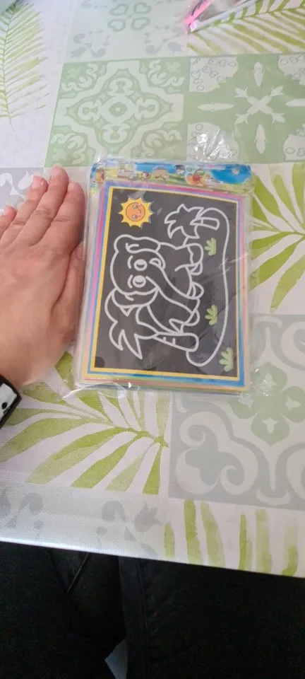 ha tardado 10 días desde el pedido,tamaño de una libreta de bolso,como la mano,muy chulo y entretenido que te lo puedes llevar en el bolso y se pongan a rascar mientras estás en el médico y así no la lían, no lo hemos probado todavía y no todas vienen juntas vienen en varias bolsitas en mi caso pedí 2 kits de chico