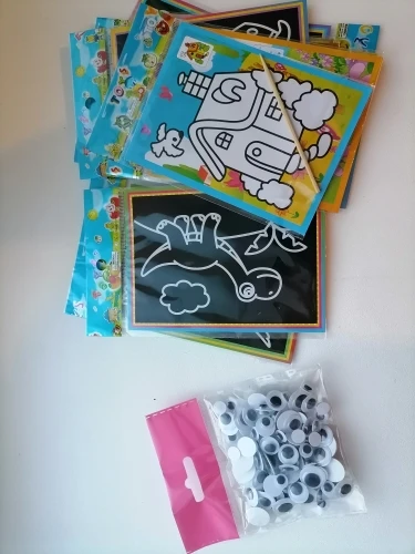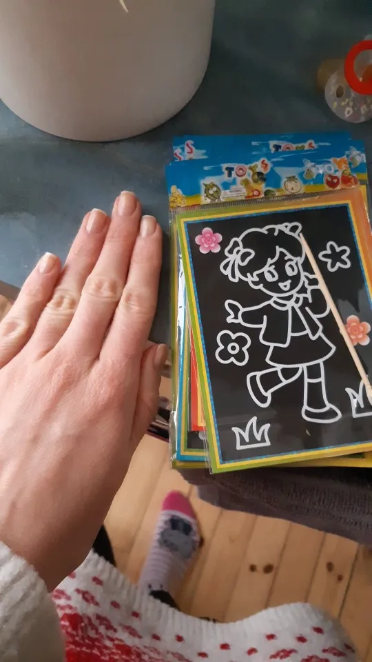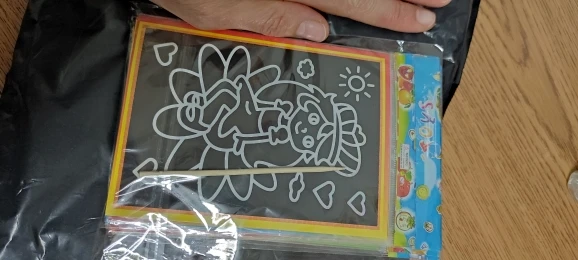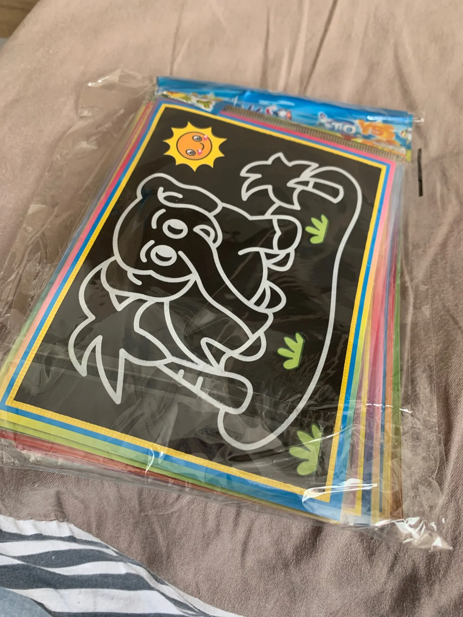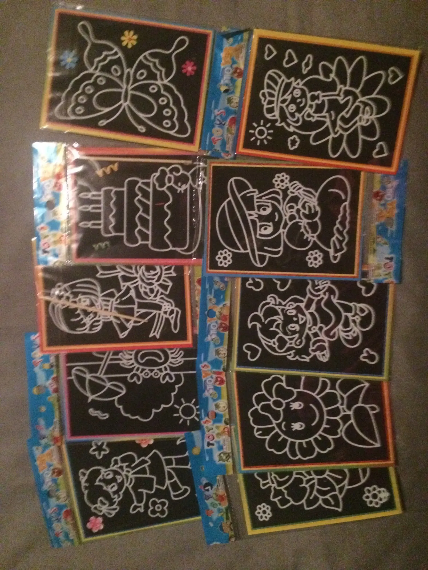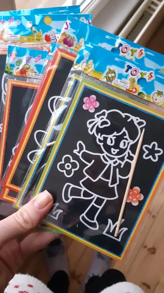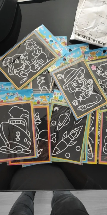 Rápido y muy bien preparado. Vienen uno a uno en paquete individual, y en cada paquete un pincel de madera para rascar. Son del tamaño aproximado de una mano. Los dibujos son muy bonitos.