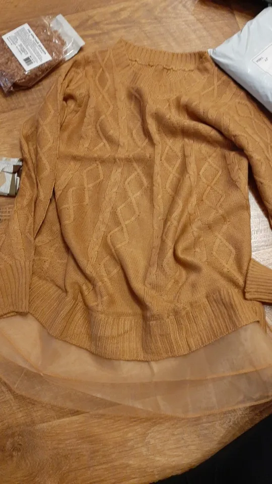 Доставка очень быстрая, две недели до Казани, по России - служба доставки DPD. Свитер чудесного качества, пару ниточек торчало, но это вообще ерунда. Размер L больше подойдёт на 42-44 рус. Сам свитер гораздо короче, чем на фото. Непрозрачная часть до поясницы, рукава коротковаты. От этого вид несколько обрубленный какой-то. Мой размер 44-46, рост 170.