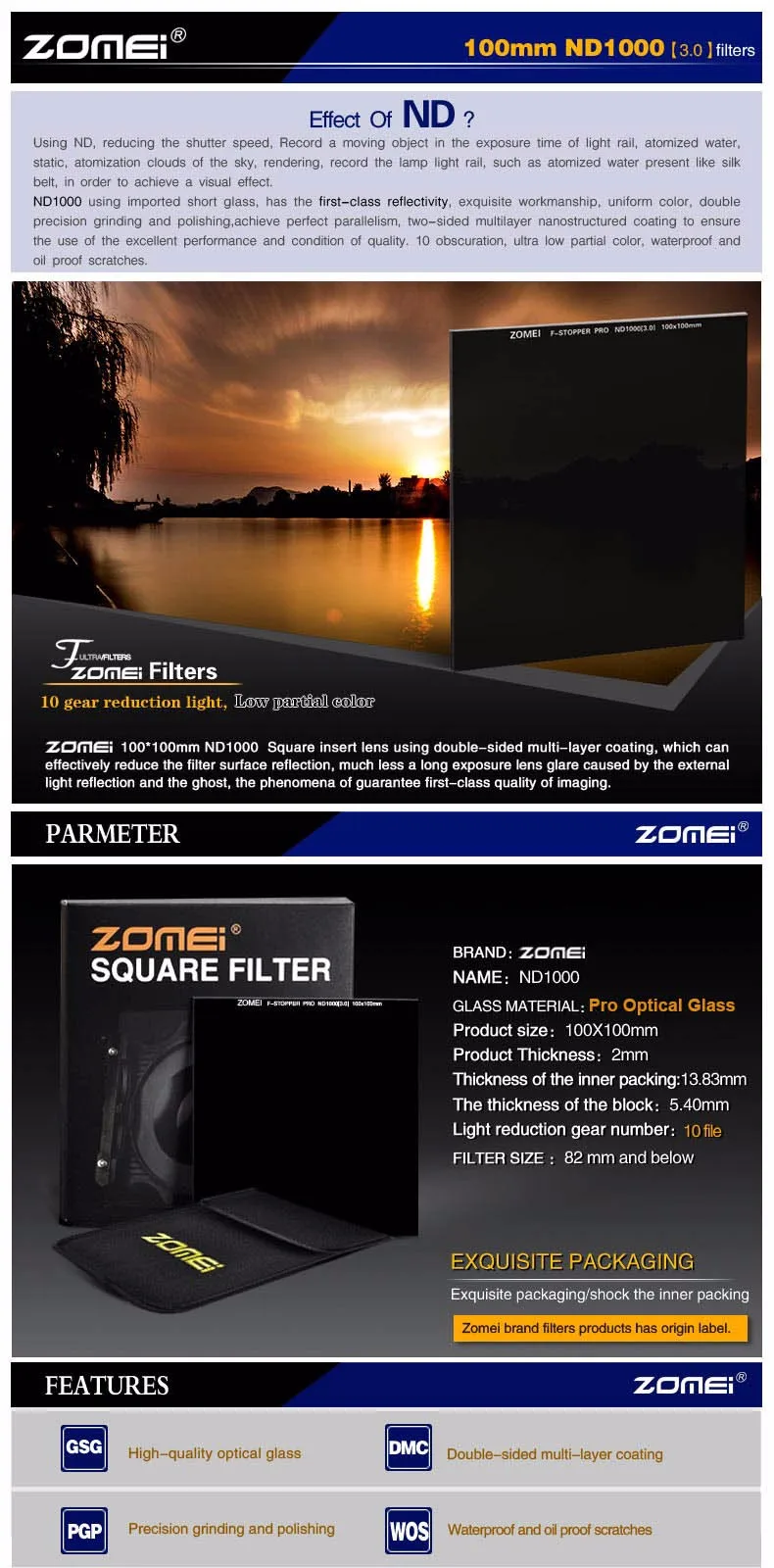ZOMEI стекло ND1000 100x100 мм квадратный фильтр * 1 (Держатель фильтра в комплект не входит)