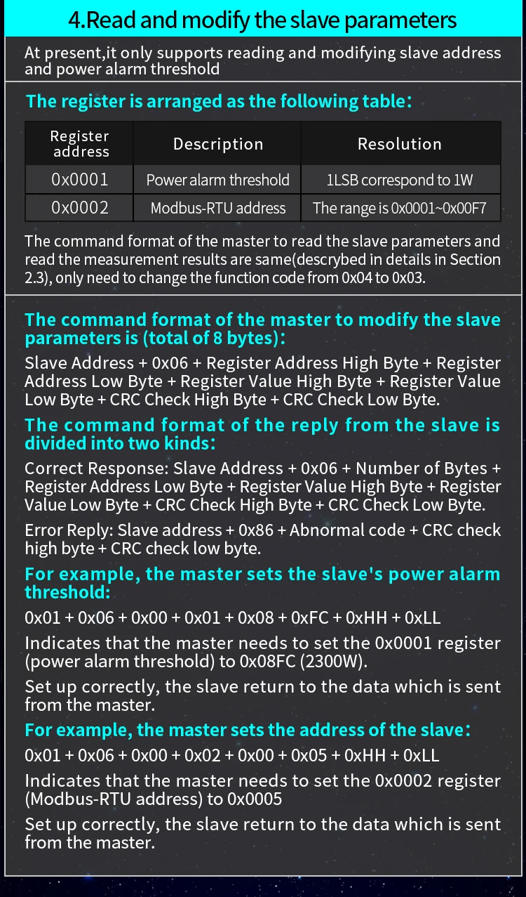 Диапазон адресов slave 0x01 ~ 0xF7. Адрес 0x00 используется в качестве адреса трансляции, подчиненному не нужно отвечать мастеру. Адрес 0xF8 используется в качестве общего адреса, этот адрес может быть использован только в одноработоспособной среде и используется для калибровки и т. Д.
