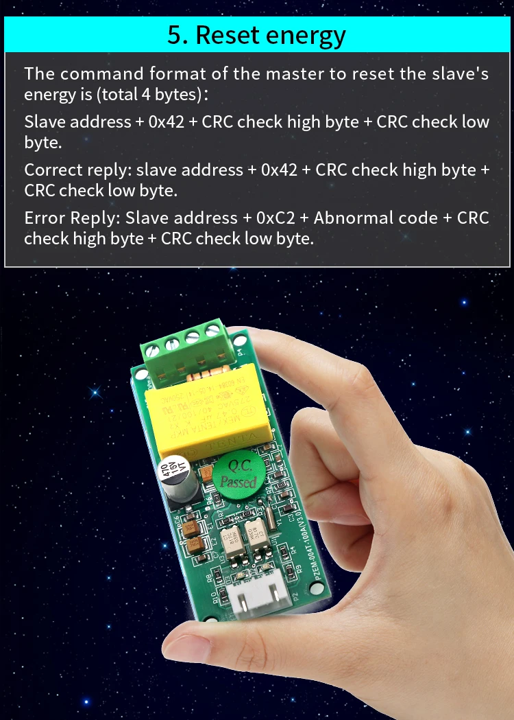 Слой приложения использует протокол Modbus-RTU для связи. В настоящее время он поддерживает только функциональные коды, такие как 0x03 (чтение холдинга), 0x04 (чтение ввода регистра), 0x06 (запись одного регистра), 0x41 (калибровка), 0x42 (сброс энергии). И т. д.
