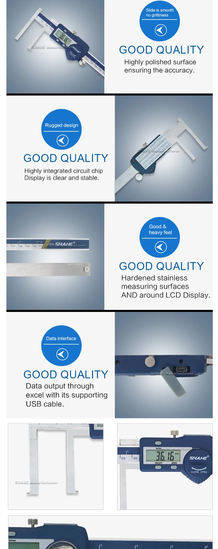1.Закаленная Нержавеющая Сталь Основные весы и измерительные челюсти2. Накатанный запорный винт для более удобного измерения и чтения3. Относительный/абсолютный обмен измерений в любом положении4. Высококачественная стеклянная фиксированная сетка, стабильная, прочная и высокая точность5. Быстрый дисплей измеряемого значения на ЖК-экране, отсутствие ошибки в скорости6. Три функциональные кнопки, с интерфейсом USB7. С кнопкой включения-выключения, автоматическое выключение, водонепроницаемый IP548. Нулевая Настройка в любом положении, конвертация измерительной системы мм/дюйма9.THin измерительная головка, удобно измерять Размер паза в отверстии