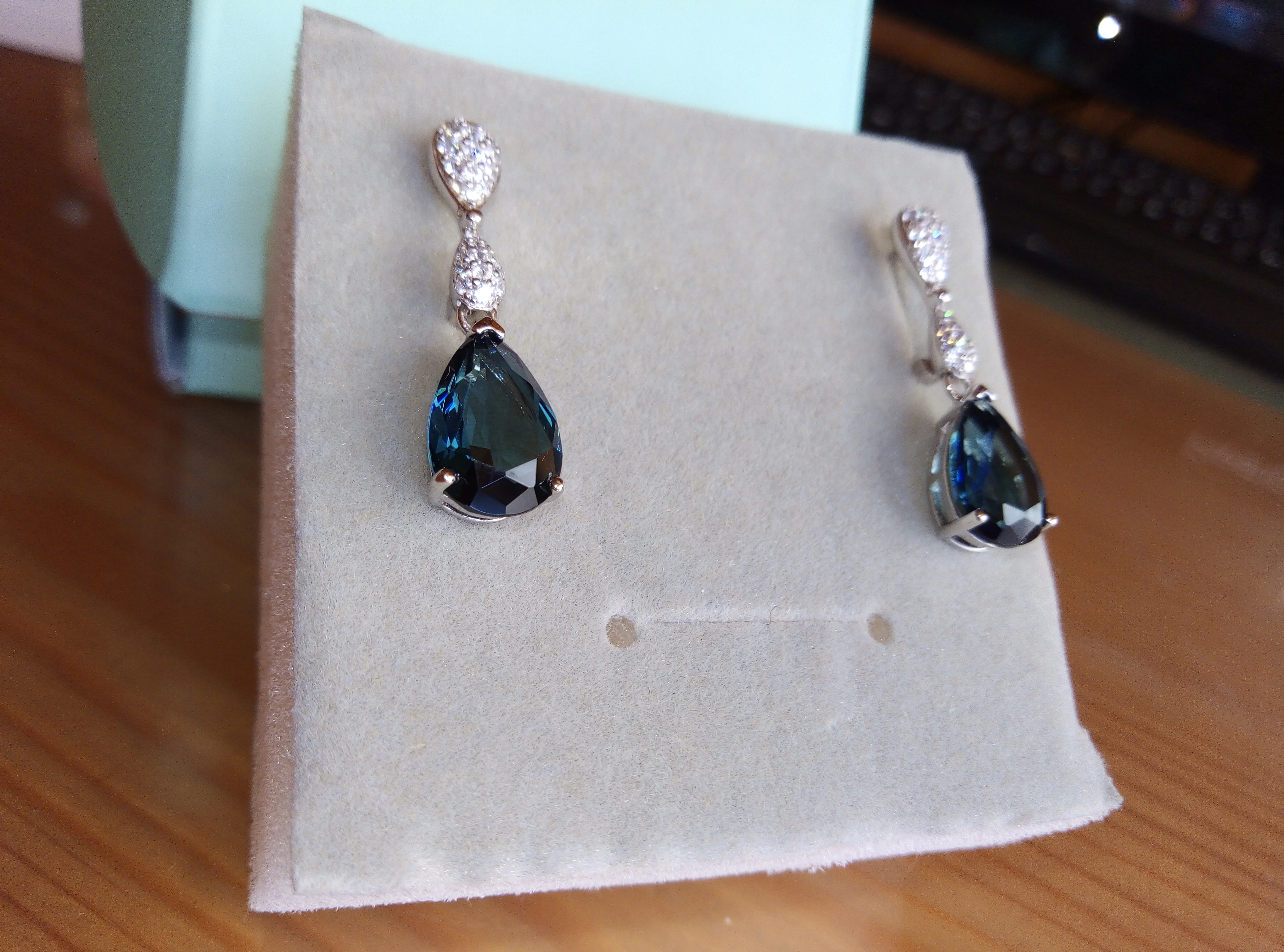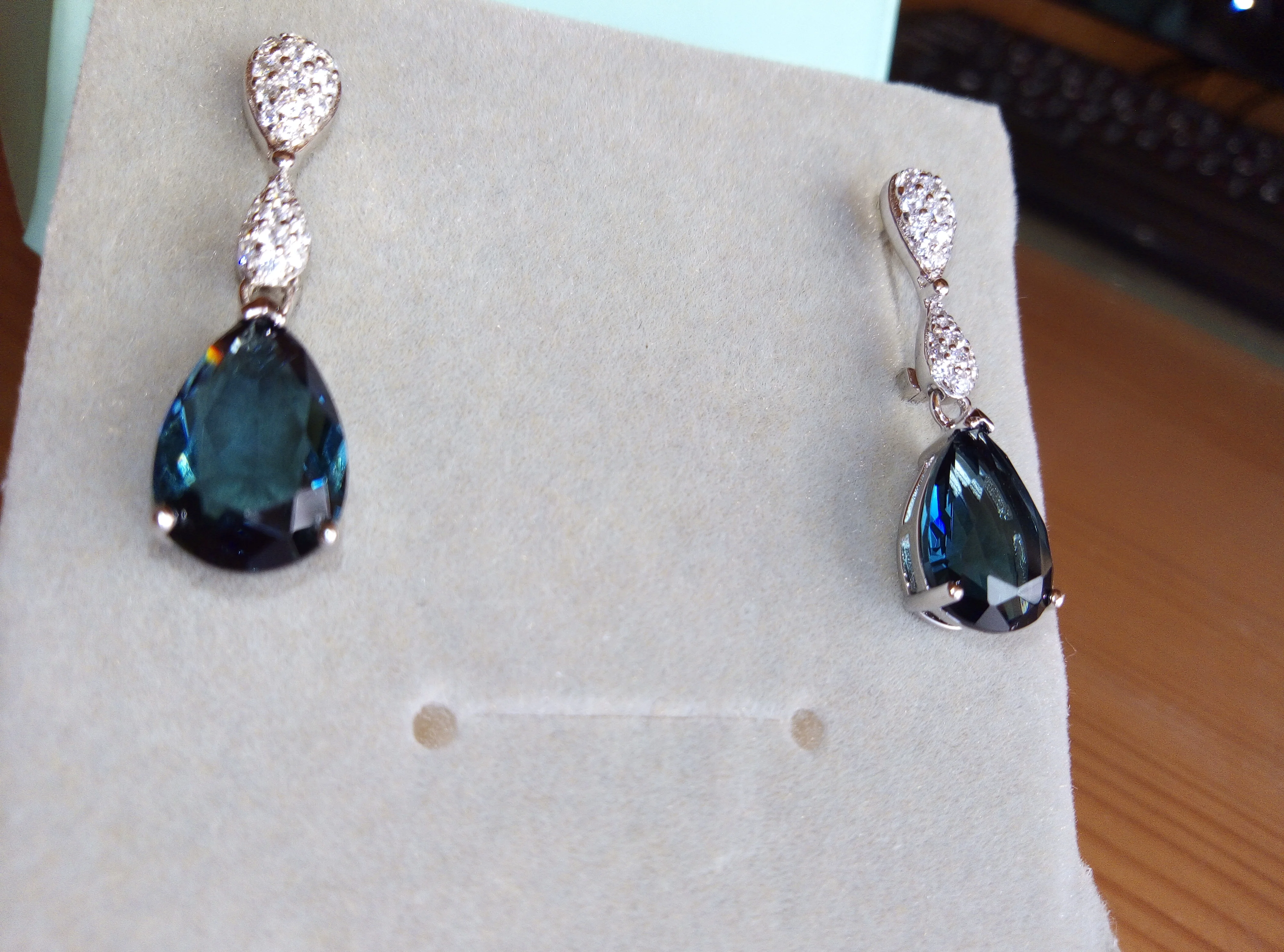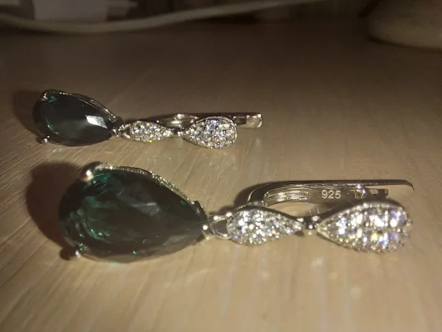 Доставка 3 недели. Серьги брала с подвеской. Очень красивый набор. Камень синий с зелёным.