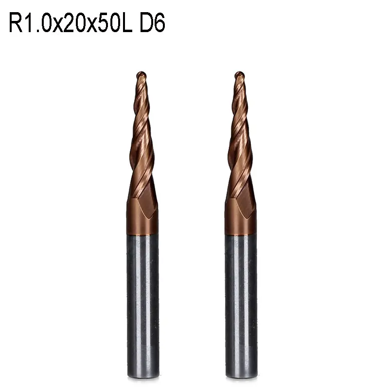 2 шт R1 * D6 * 20 * 50L * 2F HRC55 вольфрамовые твердосплавные конические концевые фрезы с шариковым покрытием, конические и конические концевые фрезы
