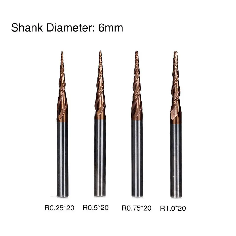 4 шт. 0,25, 0,5, 0,75, 1,0 20 л * D6 ovl50 мм коническая Концевая фреза с шариковым носом 6 мм хвостовик 20 мм канавка для резьбы с ЧПУ режущие инструменты
