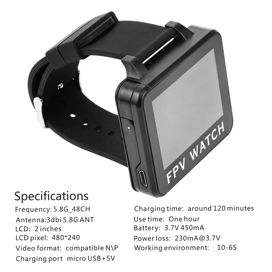 Яркость: 450 кд/м2Контраст: 500:1Антенна: входит в комплектКанал: Односторонний вход 5,8G, 4 диапазона частот, 48 каналов на выбор.Аккумулятор: литиевый аккумулятор 100 мА, время зарядки 90 м, время использования около М.Потеря мощности: 320 мА 3,7 в (макс.)Рабочая среда: -10 ~ + 65 C градусовАнтенна: встроенная латунная антенна 3dbi 5,8GКнопка питания: загрузка или выключениеКнопка CH: Длительное нажатие для регулировки ABEF частоты; Короткое нажатие для регулировки частоты 12345678Батарея: встроенная литиевая батарея мАИндикатор зарядки: Красный светильник во время зарядки, красный светильник выключен, когда аккумулятор полностью заряженИндикатор Канала: указывает на текущую частоту приема, например: E1, соответствующую красным индикаторам E и 1 будет гореть.Порт зарядки: micro USB + 5 В (Используйте только перезаряжаемый)Зарядный ток: 500 мАВремя зарядки около 90 минутВремя около 100 минутОсобенность:* Уникальный очаровательный новый продукт Boscam для фотосъемки FPV.* Часы FPV с беспроводным приемником 5,8 ГГц 48 каналов, антенна внутри.* 2 "TFT ЖК-дисплей.* Удобно и легко носить с собой. Модная и популярная одежда для мальчиков и девочек.* Для наружного вертолета, квадрокоптера. Идеальный подарок.