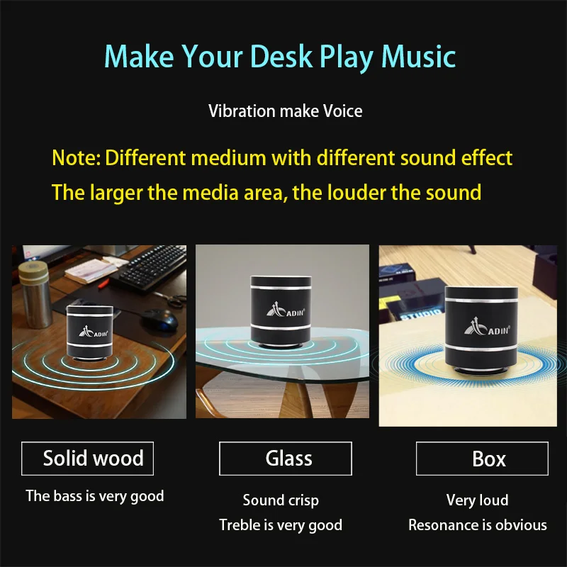 Качественная вещь, бетонную стену он конечно не возьмет (для мести соседям), что-то типа гипсокартона на ура. С ним любая поверхность становиться аккустической колонкой, причем я бы не сказал, что звук плохой. Он конечно не такой яркий как бы с пищалками, но слушать вполне себе можно. Басы зависят полностью от выбранной поверхности. В общем это блютуз колонка, где вместо динамика у вас любая прямая поверхность, которая окажется рядом