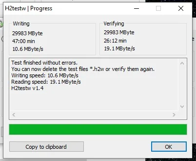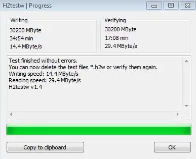 Протестировано с помощью h2testw: Тест закончен без ошибок. Теперь вы можете удалить тестовые файлы *.h2w или проверить их снова. Скорость записи: 10,6 Мбит/с Скорость чтения: 19,1 Мбит/с H2testw v1.4 Хорошая сделка по цене. (32gb ~ R$ 18,50 em Янь/21)