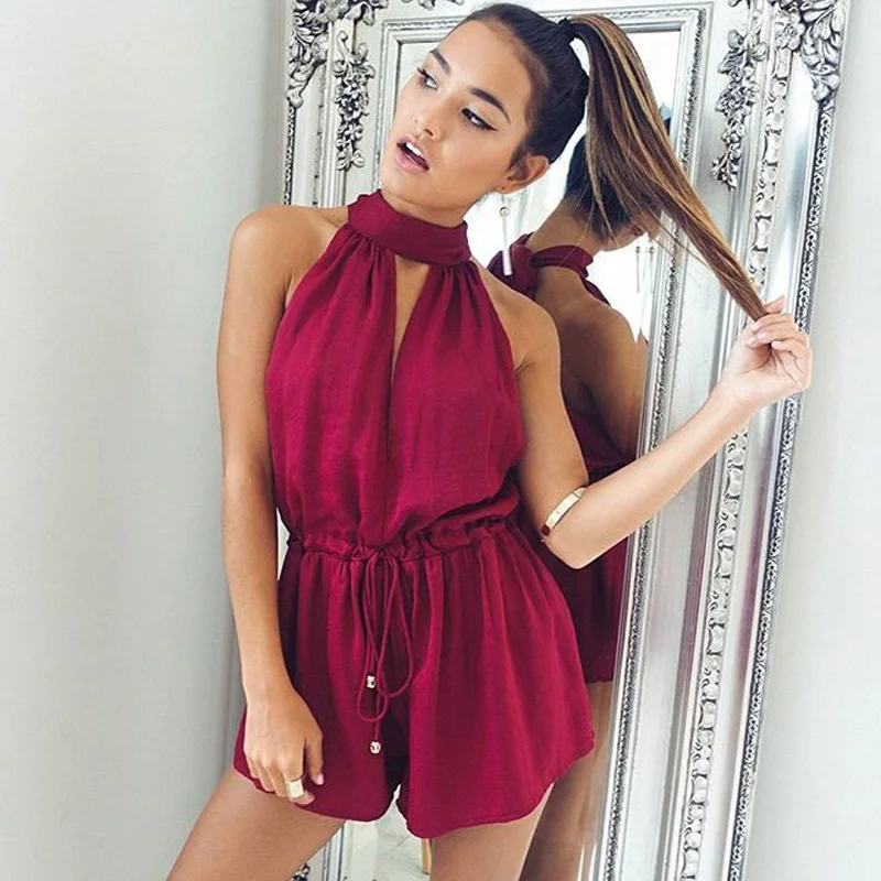 Комбинезон женский с лямкой через шею и шортами, модный темно-синий винно-красный пикантный укороченный топ с открытой спиной, летний Ромпер icon star icon star icon star icon star icon star