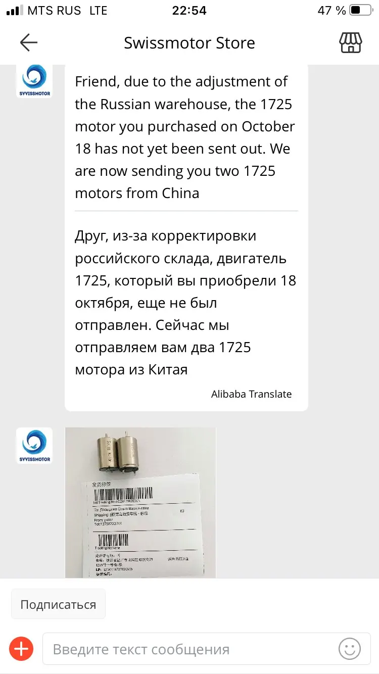 Отвратительно все! Заказывал сначала один мотор, тупанул и заказал с доставкой из Китая(как они утверждают). Заказал через недельку второй, с доставкой из Москвы, по присланной продаваном ссылке, чтобы получить раньше. В итоге они сказали «сорян, отправим вам этот и предыдущий мотор одним паком»(то есть с предыдущим они даже не суетились пару недель)и отправили, самым дешёвым методом, без отслеживания. И сегодня эти м..даки мне сказали, что «сорян, но один мотор прое..бался, а второй где к вам едет, с седьмого ноября(заказан был ещё в октябре». Вопрос! Как мог прое..браться мотор из посылки, а второй не прое..бался?! Пробован в диалоге несёт лютую чушь. Открыл спор, один удовлетворили, деньги вернули, второй сказали жди