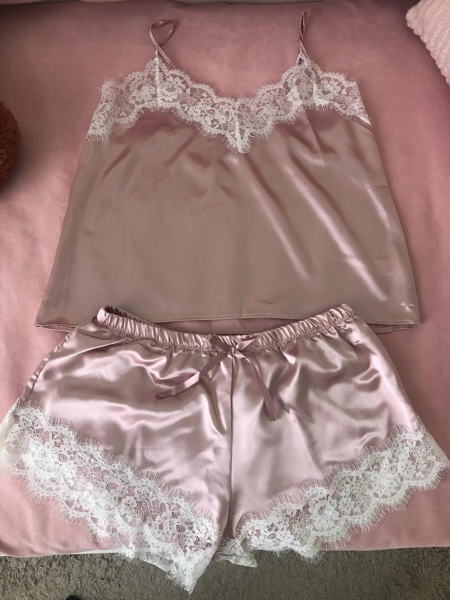Атласный пижамный комплект, кружевная отделка, пижама, короткие штаны, сексуальный Cami, Свадебный Пижамный костюм для женщин