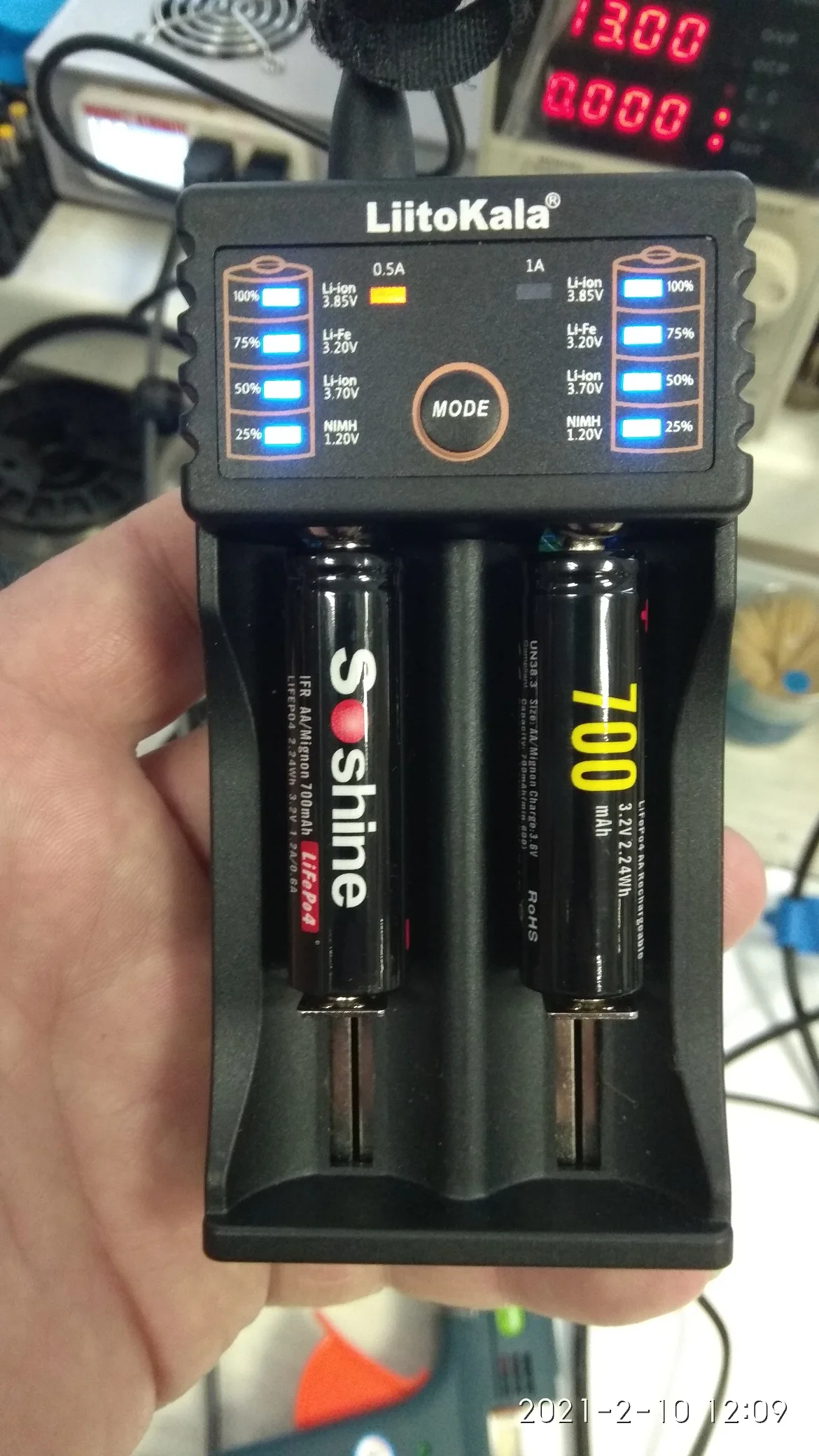Звезды только за честность. Если не ошибаюсь, шло больше 3х месяцев. 4 аккумулятора и 2 проставки. Напряжение на элементах 3.2 В.