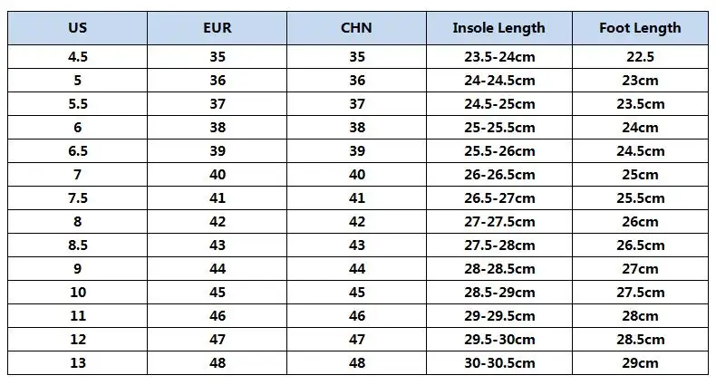 1. Пожалуйста, выбирайте размер в соответствии с длиной Вашей стопы. 2. Если фактическая длина вашей стопы 23 см, размер обуви 5 подходит для вас.