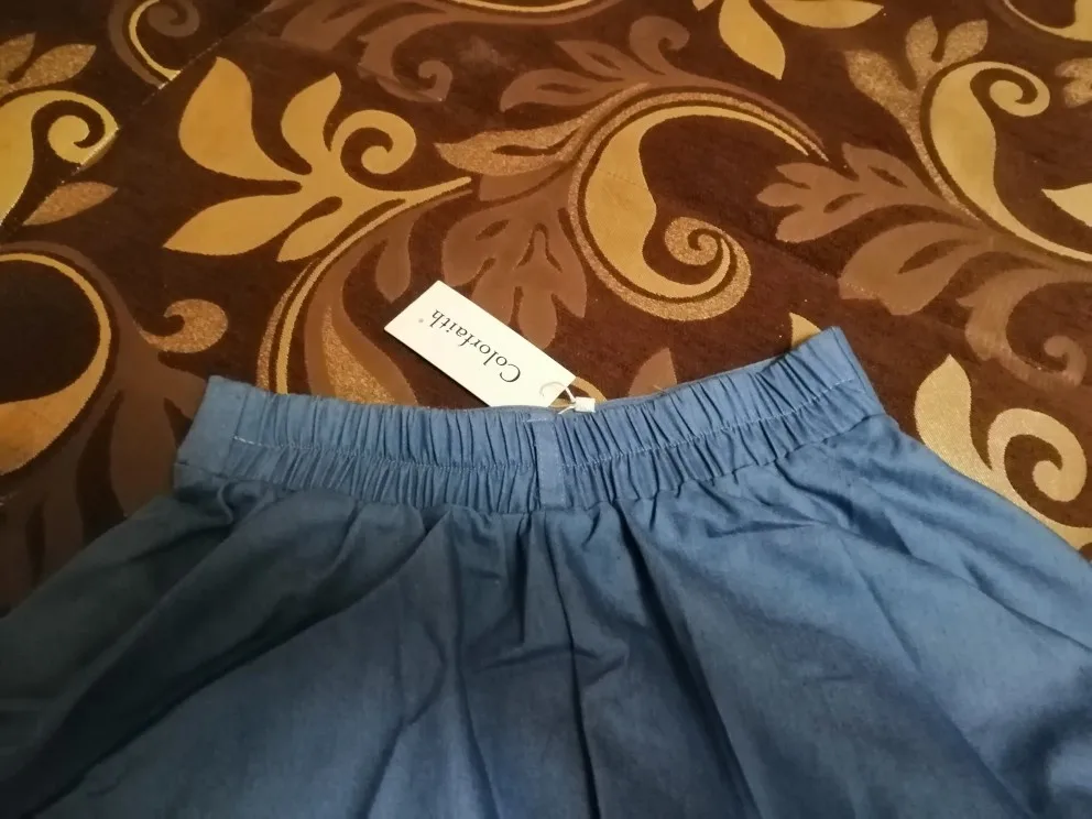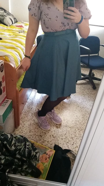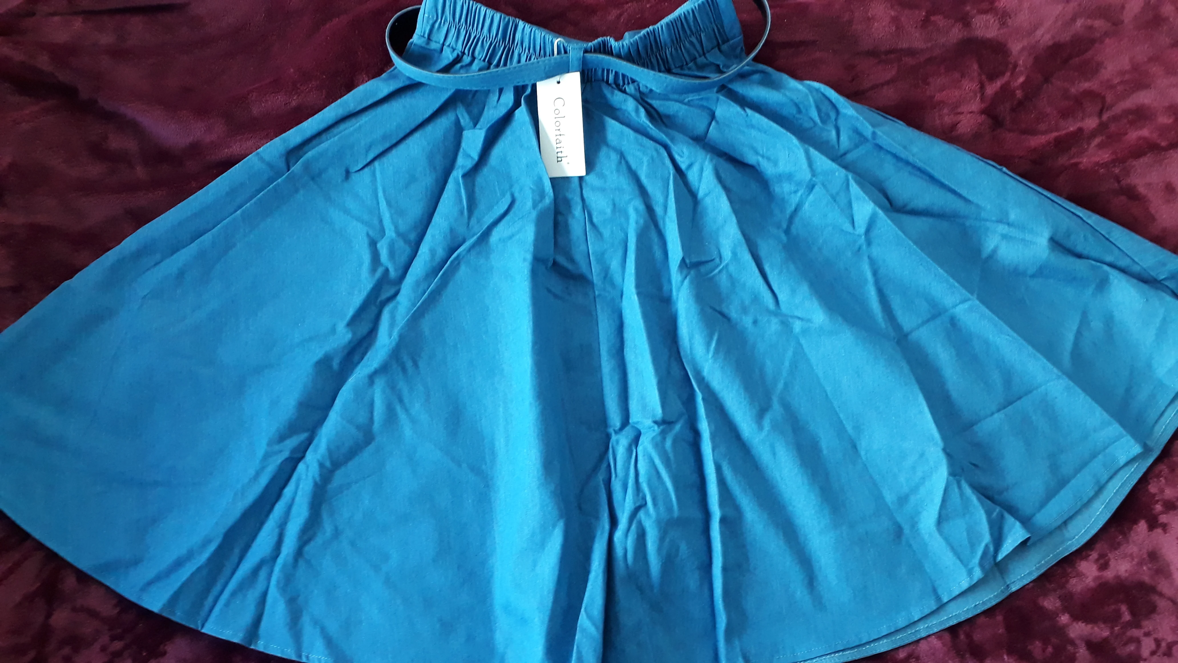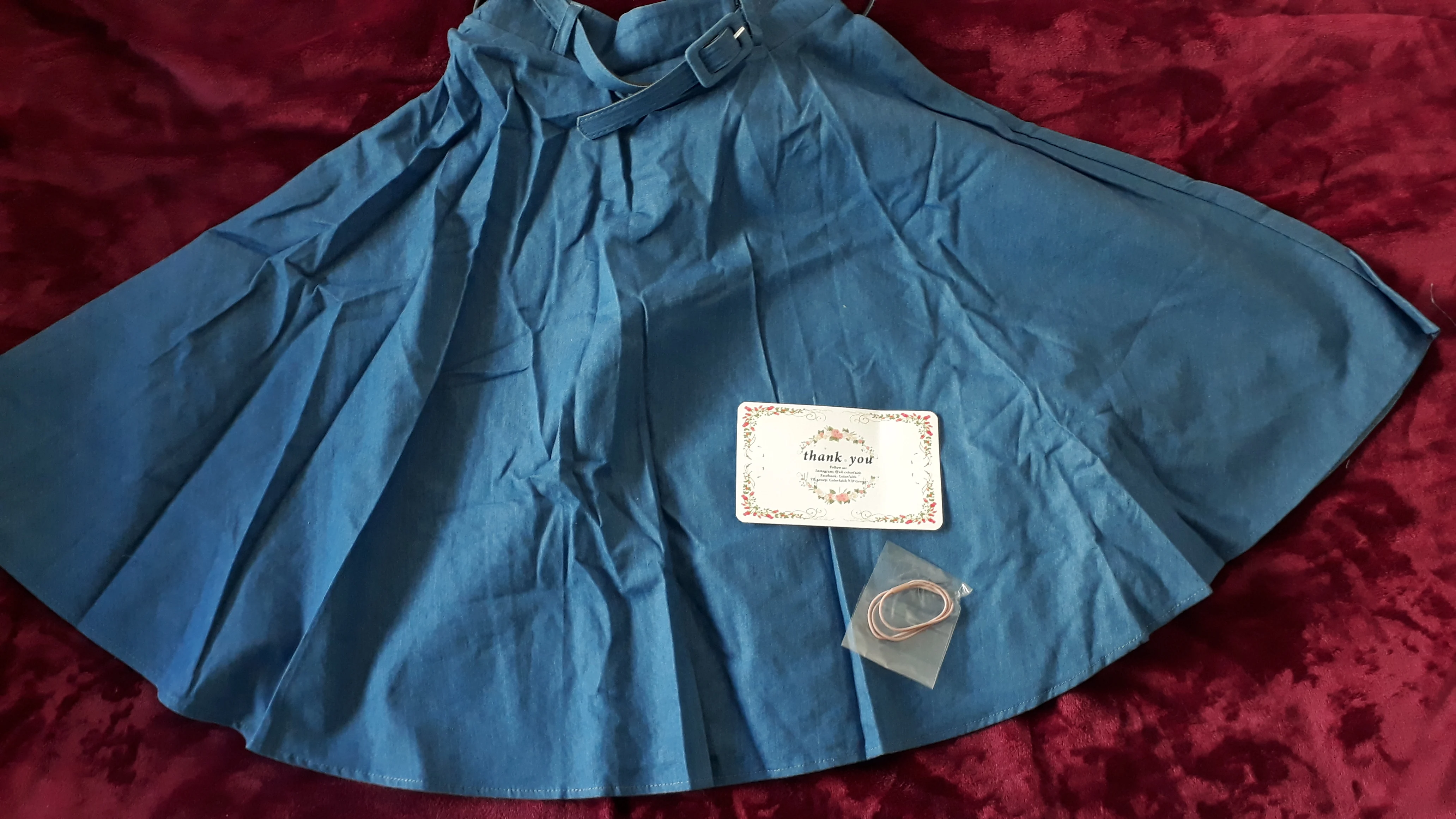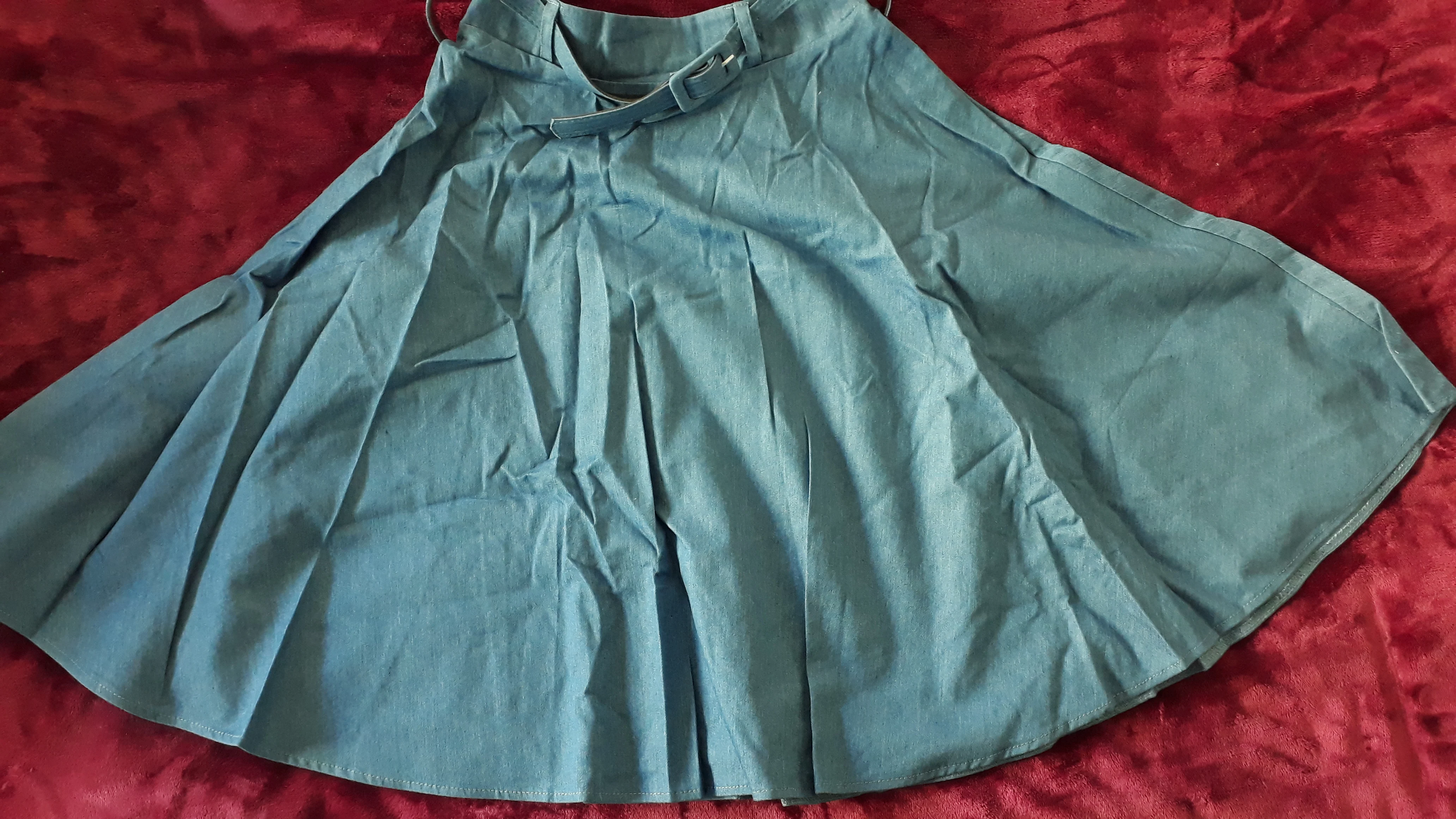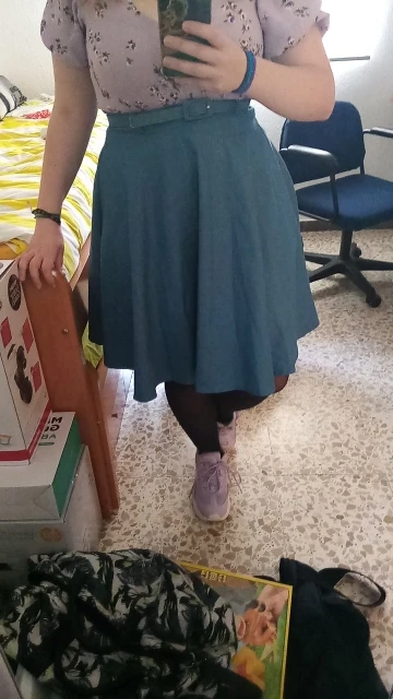 La falda tiene una tela agradable y tiene buen vuelo. El cinturón queda muy bonito y la talla es correcta para mi porque tiene un elástico detrás. Yo suelo tener la 40-42 de pantalón y me queda perfecta. La recomiendo. No tardó tampoco mucho en llegar, asi que si vuelvo a ver ropa que me gusta de la tienda volveré a comprar.