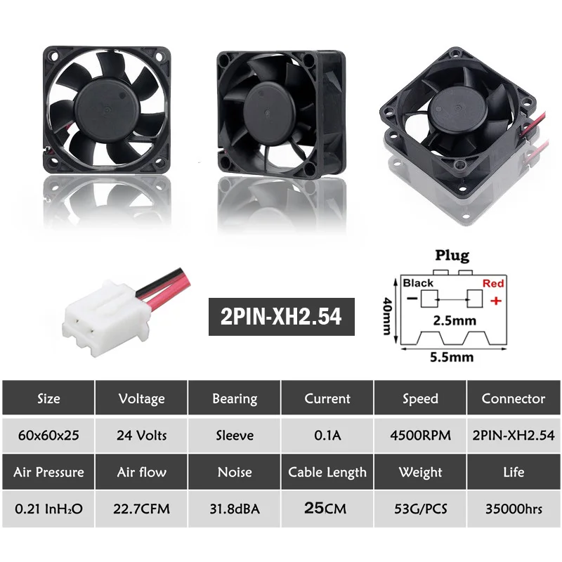 Размеры: 60x60x25mm Номинальное напряжение: 24 В постоянного тока Разъем: XH2.54-2Pin Подшипник Тип: изолирующая трубка Номинальный ток: 0.1Amp ± 10% Номинальная скорость: 4500 об/мин ± 10% Поток воздуха: 22CFM ± 10% Уровень шума: 31,8dba ± 10% Срок службы: 35000 часов Длина кабеля: 25 см Вес: 53 г/шт.