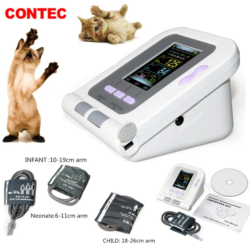 Цифровой прибор для измерения артериального давления CONTEC 08A-VET, ветеринарныйЖивотный датчик NIBP + SPO2 (дополнительно), три манжеты, адаптер питания