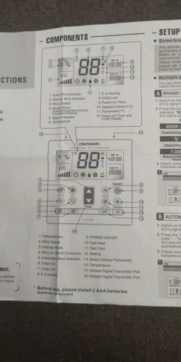 Универсальный пульт дистанционного управления для кондиционеров K-650e CHUNGHOP, с кронштейном для подсветильник Ки