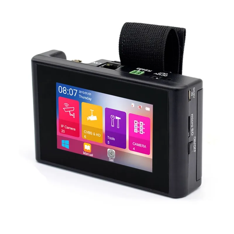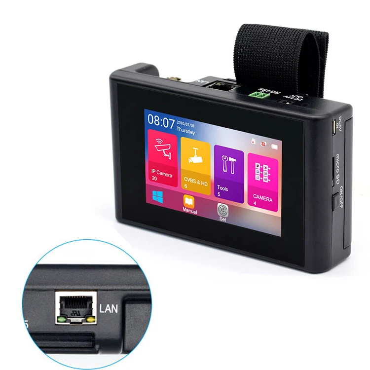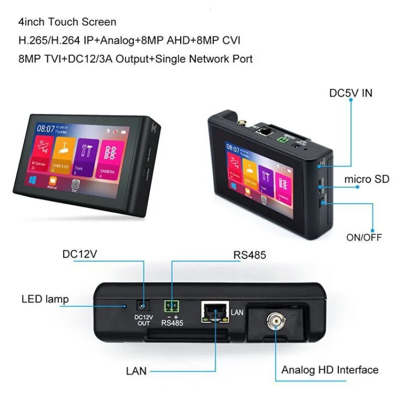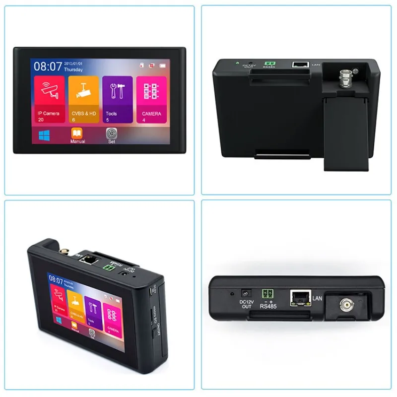 Прибор использует умную операционную систему, в основном используется для установки и обслуживания сетевых камер наблюдения, аналоговый видео монитор камеры и других устройств наблюдения за безопасностью, прибор принимает 4-дюймовый HD IPS полноэкранный дисплей экран, может четко отображает IP и аналоговые камеры видео изображения. Он построен в различных сетевых инструментах, включая пинг, сканирование ip-адреса, выходная мощность DC12V/2A, это важный инструмент для проектов мониторинга безопасности и проектов интегрированной проводки