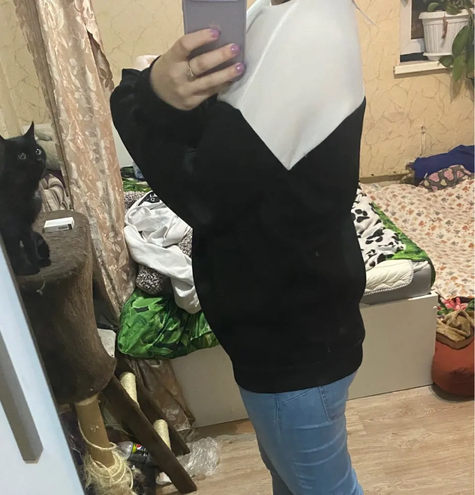 Толстовка красивая, но мне не понравилось, как смотрится именно на мне, поэтому объективно оценить не могу. К тому же, на белой части было черное пятно, которое не отстирывается 4 звезды из-за пятна, так-то качество хорошее, и доставка быстрая