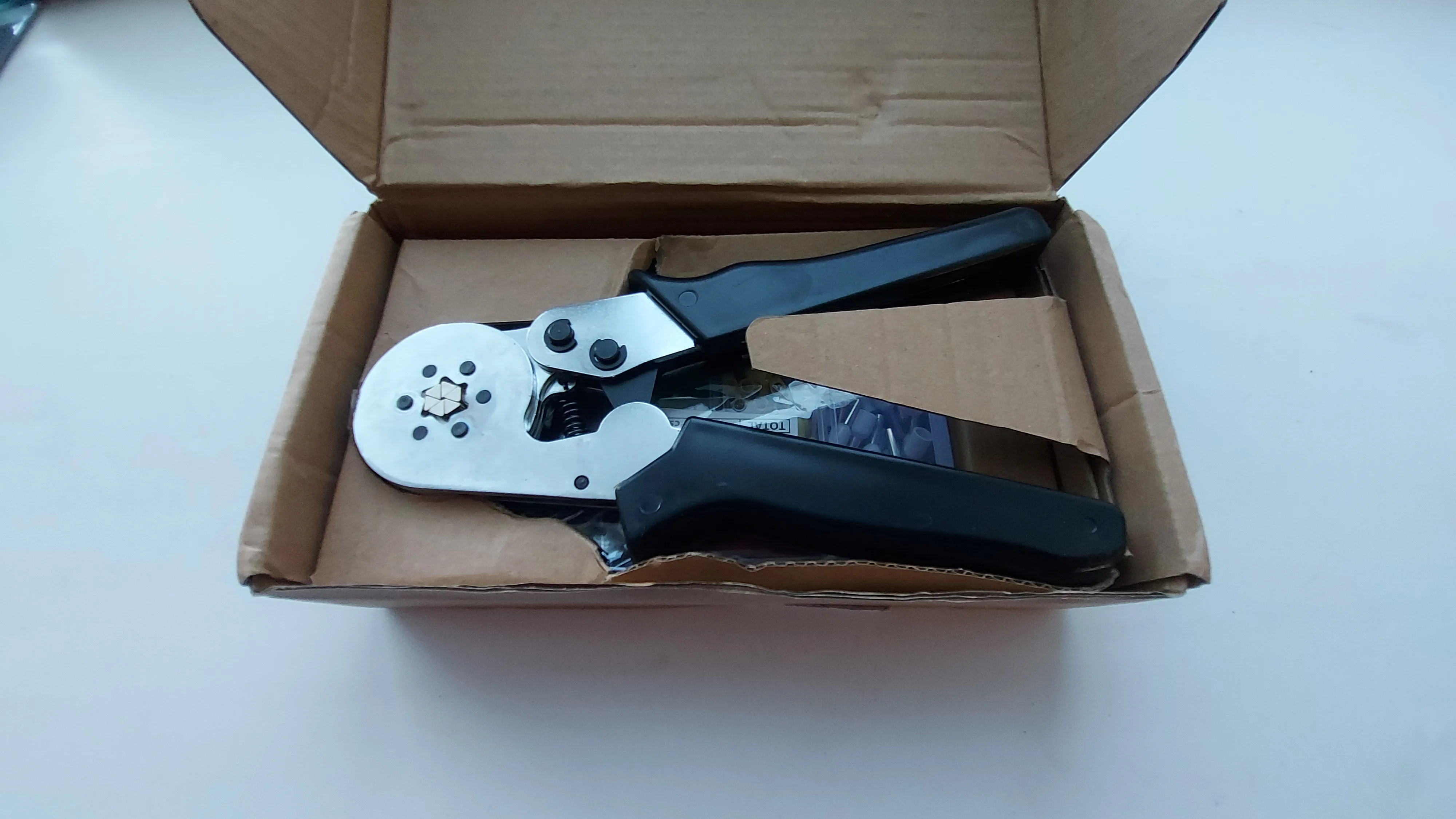 товар получен в картонной упаковке, соответствует описанию. в комплекте набор наконечников и черный маркер. Стоит отметить что изделие удобно, ввиду небольших габаритов. Я ожидал большего размера этого пресса. В ходе работы появилась особенность, губки пресса не полностью сходятся на стороне, обратной проводу. Однако, снять наконечник удалось только с помощью инструмента, поэтому нельзя сказать, что это недостаток или брак. пресс со своей работой справляется.