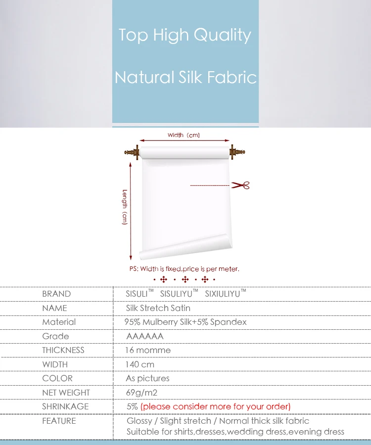 * 95% шелк тутового дерева + 5% спандекс; * 16 момме, 140 см ширина; * Коэффициент усадки: 3-5%, пожалуйста, учитывайте это в своем заказе; * Матовые, нормальные толстые, легкие, слегка тянутся; * В основном для рубашки, платья, шарфа