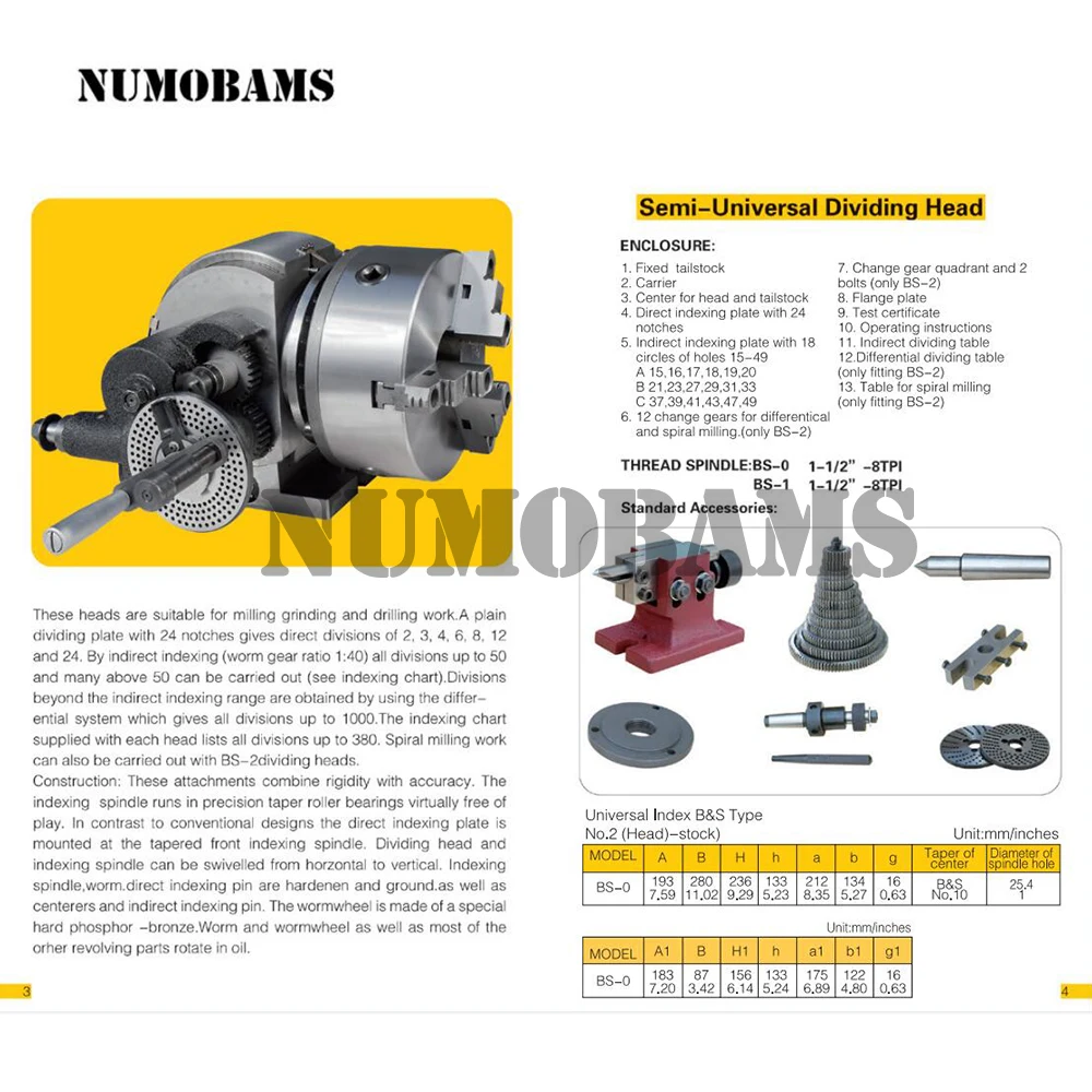 Полууниверсальная делительная головка Numobams BS-0 с 3-кулачковым патроном 100 мм для металлического фрезерного станка