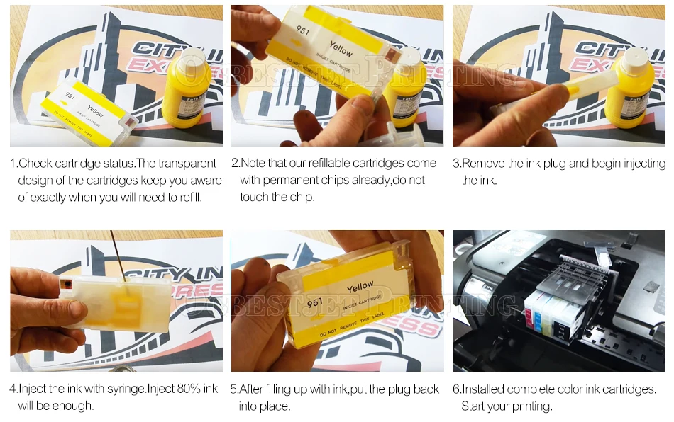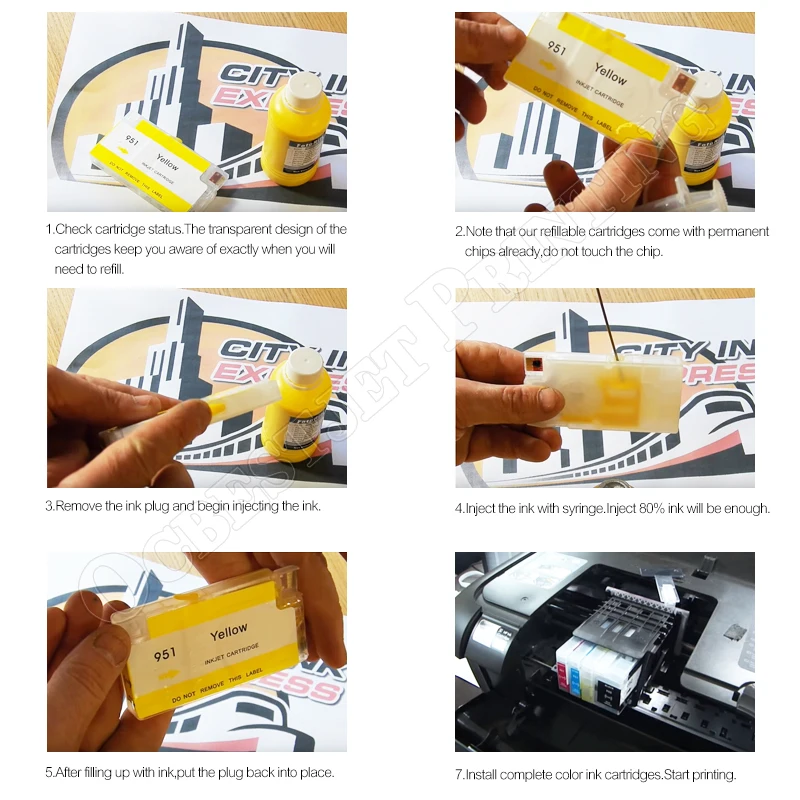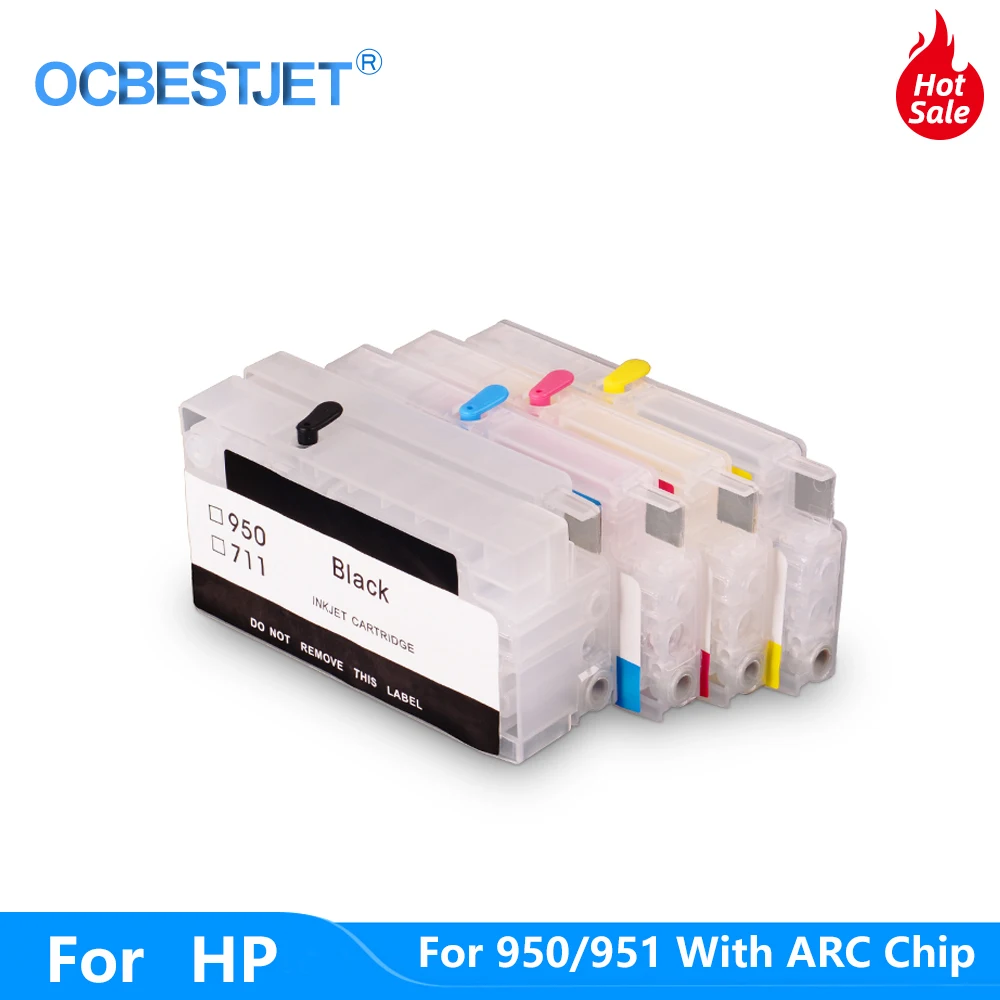 Название продукта: пустой многоразовый чернильный картридж, чернильный бак Модель картриджа: 950-черный 951-голубой 951-пурпурный 951-желтый Номер OEM: CN049AN CN050AN CN051AN CN052AN Цвет чернил: BK C M Y Емкость чернил: BK - 50 мл C/M/Y-20ML Тип чипа: с чипом ARC, постоянным чипом Применимый Тип чернил: краситель чернил/Пигментные чернила