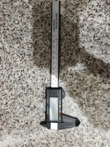 Штангенциркуль сделан из ABS-пластика, но написано, что из "углеродного композитного волокна" Шкала до 150 мм / 6 дюймов. Удобно, что измеряет дюймы, например в водопроводных делах, когда глазомер хромает - очень полезно. Для работы прибора нужна 1 батарейка SR44 / LR44 1,5V (не идёт в комплекте).
