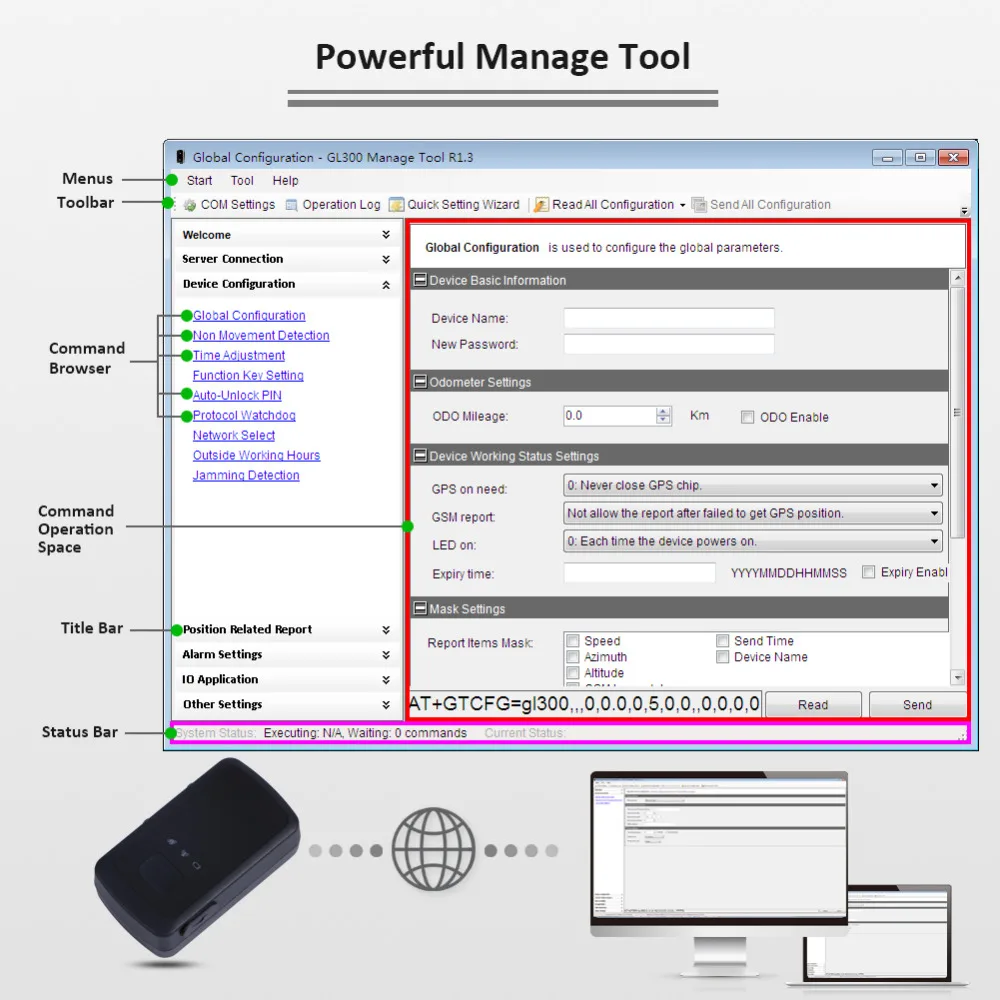 GL300 manage tool-это программное обеспечение для ПК, которое можно использовать для настройки GL300 через UART. Разработчикам backend сервера легко настроить GL300 с инструментом управления, который имеет дружественный пользовательский интерфейс. Правильные командные сообщения, отправленные GL300, будут отображаться на инструменте управления. (эти сообщения также могут быть отправлены SMS или GPRS).