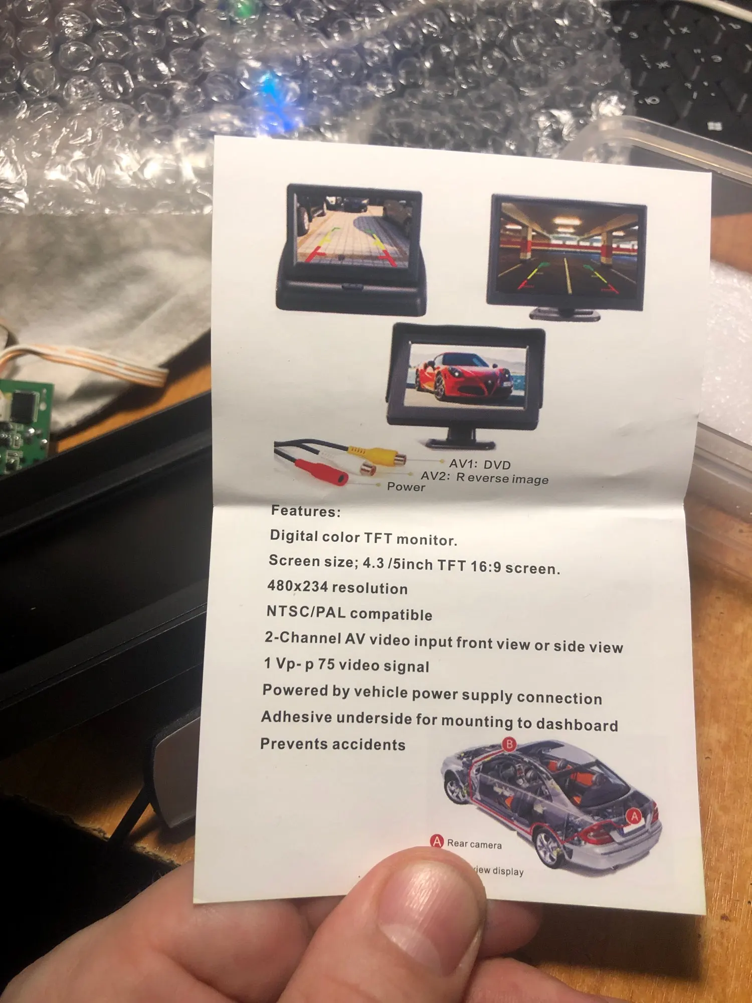 Хороший продукт, хороший продавец и быстрая доставка. Дисплей хорошо упакован. Доставка во Францию всего за 15 дней после заказа. AV1 переопределения AV2 при использовании обоих входов. Направляющие линии на дисплее доставляются камерой и не отображаются, когда используется другой источник видео-входа .. Дисплей совместим с NTSC/PAL и имеет разрешение 480x234.