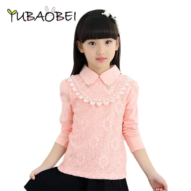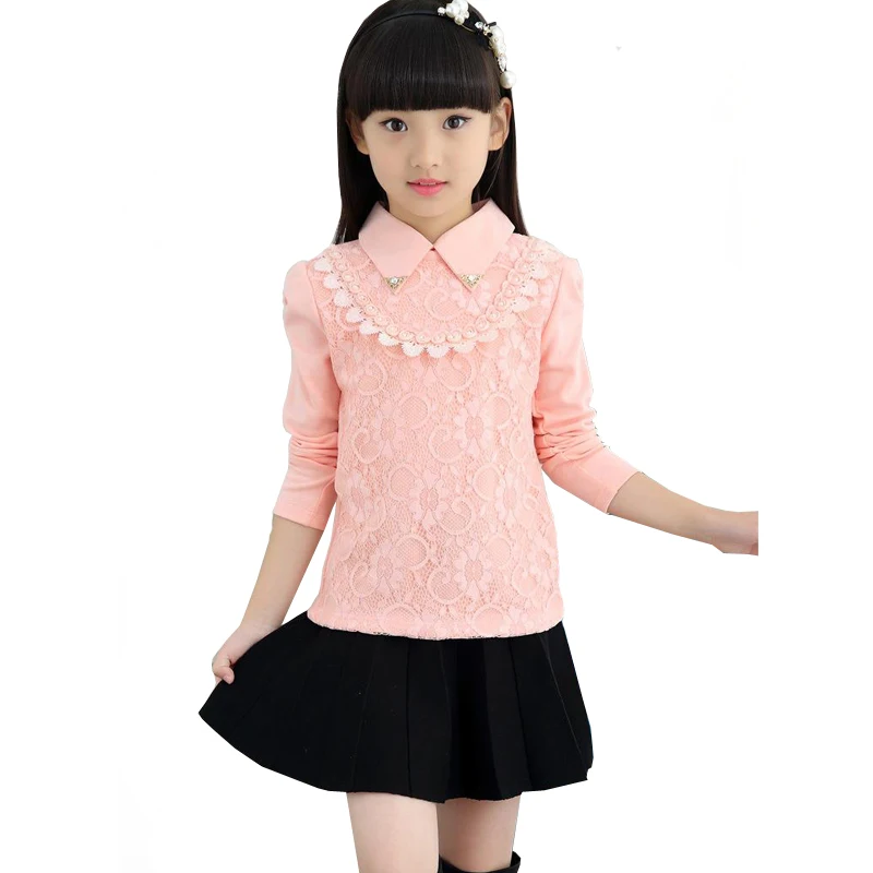 Новинка 2021, осенне-зимняя розовая плотная теплая рубашка для маленьких девочек, детские школьные топы для девочек с отложным воротником, кружевные топы, детская хлопковая блузка
