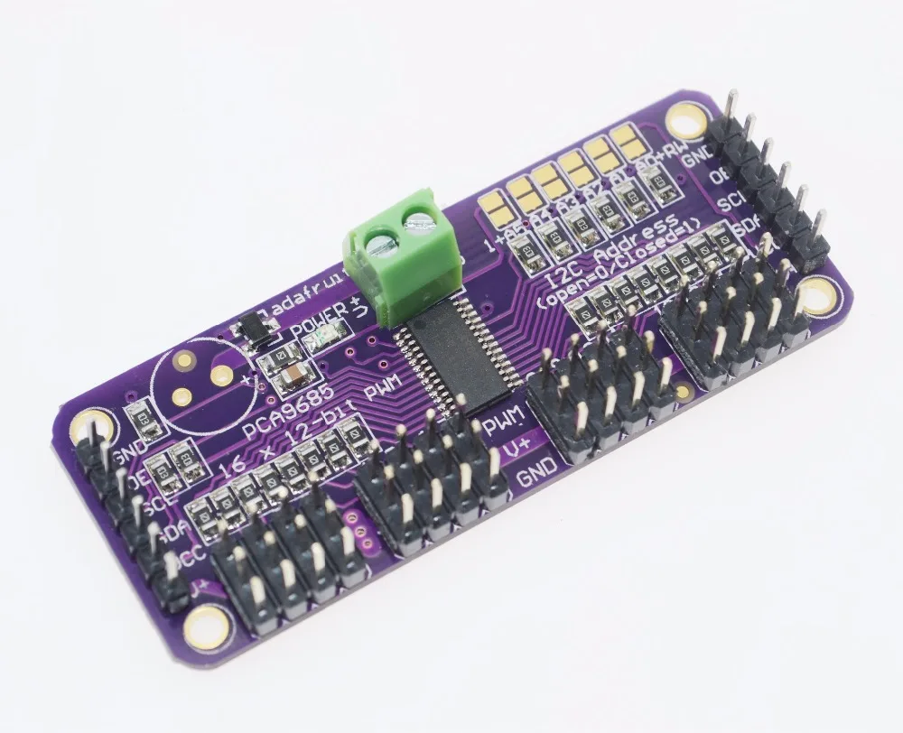 • 6 адресов выбирают контакты, так что вы можете подключить до 62 из них на одной шине i2c, в общей сложности 992 выходов-это много сервоприводов или светодиодов
