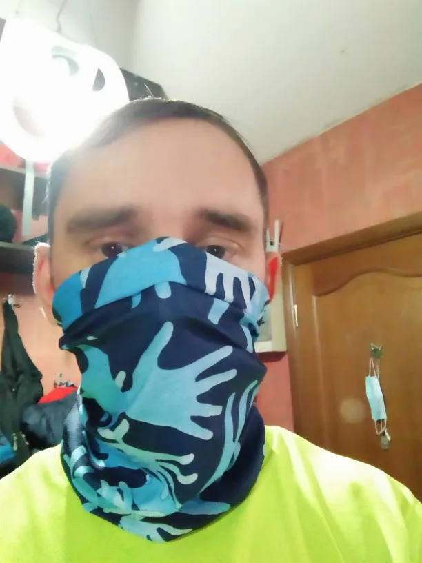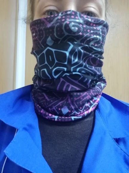 Стало незаменимым атрибутом посещения общественных мест.На шее не мешает,материал очень эластичный,дышится без проблем как и натягивается на лицо.Это уже третья покупка здесь за два года...Кто бы знал...