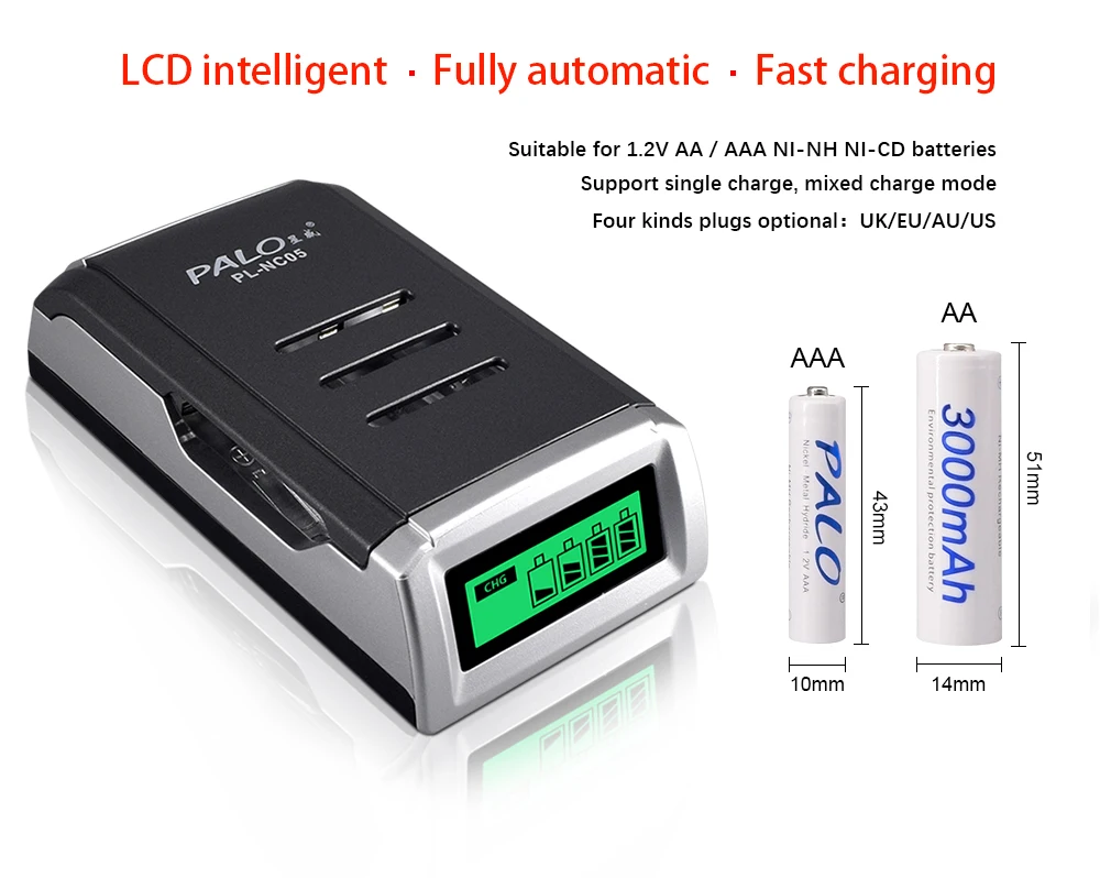 1. Интеллектуальное зарядное устройство для аккумуляторов, только для 1,2 V AA, AAA, никель-металл-гидридных или никель-кадмиевый аккумулятор перезаряжаемый аккумулятор.2. ЖК-дисплей, ЖК-экран будет отображать процесс зарядки аккумулятора.3. Независимый зарядный канал, множественная защита, поддержка быстрой зарядки аккумулятора4. Переменный ток 100-240 В, широкое напряжение, по всему миру, для любой страны5. В конце процесса зарядки Встроенный микрокомпьютер преобразует режим зарядки от быстрой зарядки в непрерывную зарядку, обеспечивает полную зарядку аккумуляторов и предотвращает чрезмерную зарядку6. Постоянный ток предотвращает колебание тока, обеспечивает безопасность зарядки.7. Функция автоматического распознавания: Уникальный алгоритм для обнаружения плохих или дефектных ячеек, автоматически обнаруживает незаряжаемый или одноразовый аккумулятор и прекращает зарядку.8. Посылка содержит: зарядное устройство, зарядный кабель и руководство пользователя9. Примечание: Данное зарядное устройство не может заряжать 1,5 V батареяПартномер: 1,2 V AA AAA батарея зарядное устройствоВход: 100-240 В переменного тока, 50/60Hz 5 Вт МаксВыход:1,2 V, DC 1200mA,AA: 1200mA * 1/ 600mA * 2/ 300mA * 3/ 300mA * 4AAA: 600mA * 1 / 300mA * 2 / 150mA * 3/ 150mA * 4Совет: Мы отправим стандартные вилки европейского стандарта по умолчанию, если вам нужны другие стандарты, пожалуйста, оставьте нам сообщение или замечания в заказе