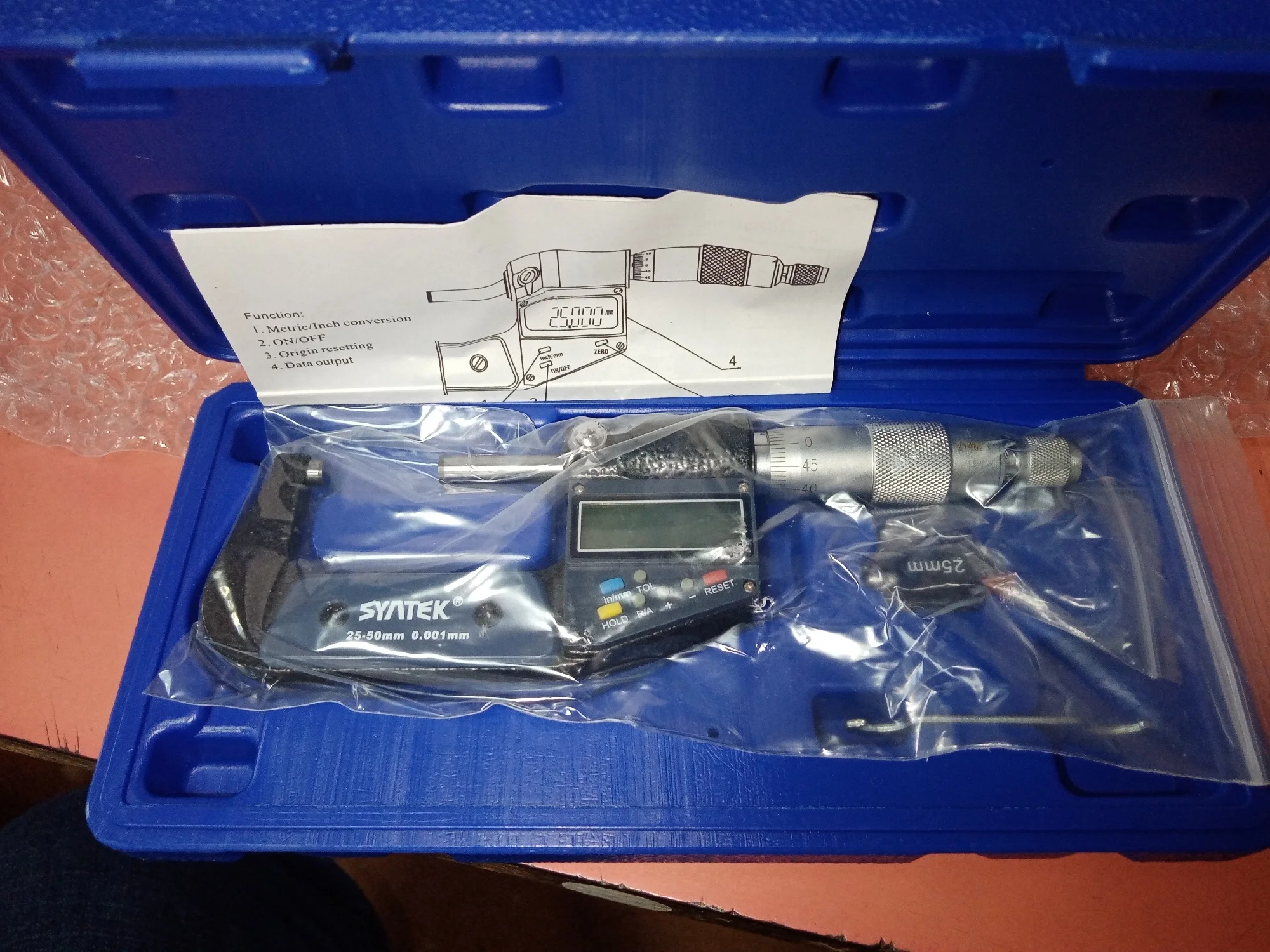 Купил 3 размера: 25-50; 50-75; и 75-100. 25-50 меня разочаровал: вращение винта неравномерное, с каким-то "скрежетом" внутри, в отдельных местах усилие надо прилагать такое, что сам корпус стремится вырваться из рук. Такое ощущение, что либо микрометрическая резьба рваная, либо в зазор винт/гайка попал мусор. Разобрать и прочистить соединение не представляется возможным, т.к. доходя до значения около 52÷53 мм, винт клинится и до конца не вывинчивается. И, кстати цанговой гайки для регулирования среднего диаметра рабочей резьбы не предусмотрено. Так же разочаровало исполнение цифрового блока: к струбцине прилегает не плотно, с зазорами, необходимо беречь от воды и пыли!