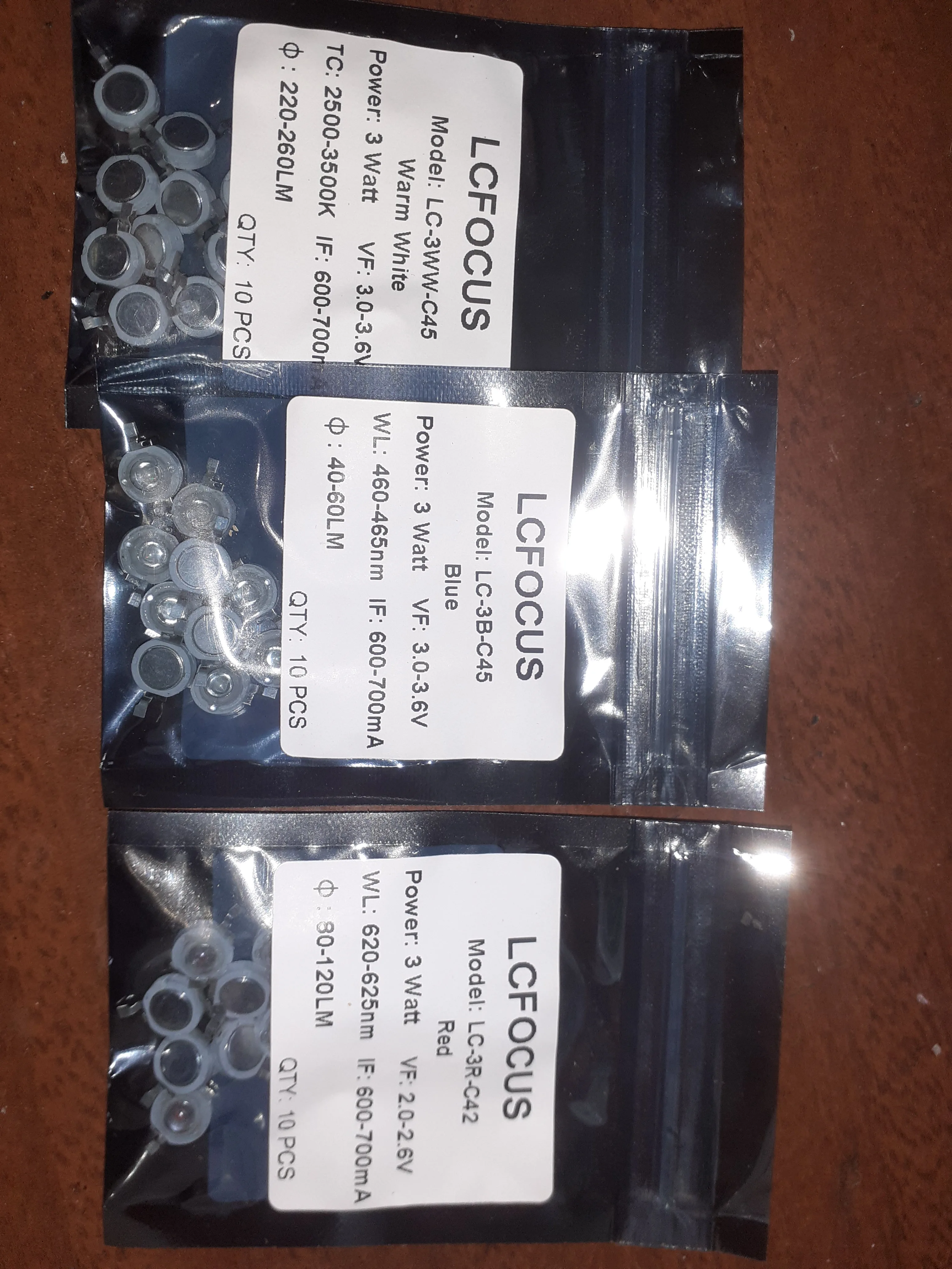 Заказывал 3W: красные 660nm (1,72V), 30000K (2.65V), зелёные 520nm (2.31V), синие 460nm (2.55V), инфракрасные nm 735 (1,56V), Ультрафиолет (2,93V). Мне кажется не соответствует заявленному вольтажу