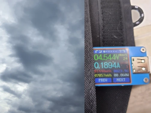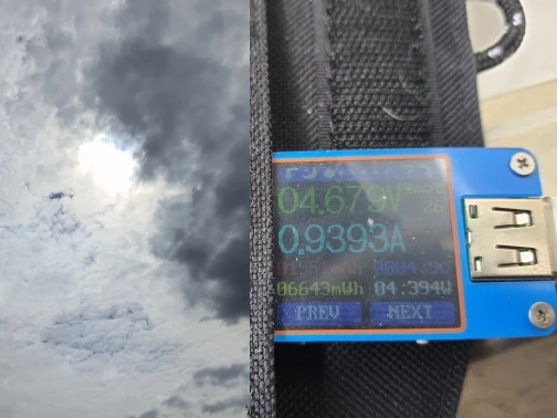 ехала чуть больше недели с момента отправки. Пробовал протестировать через окно, очень слабо заряжает. На открытом воздухе уже лучше. На первом фото солнце поднялось до 42°, было безоблачно, 2.4A и 5V на 1 usb отдавала, с неидеальным расположением панели, и не самым высоким солнцем. 2 и 3 фото солнце поднялось до 48° но на 3 фото практически полностью зашло за плотные облака, но какая то генерация еще остается. Пробовал по одной закрывать каждый из 3х элементов от солнца отдельно, генерация полностью не прекращается, падает на треть только. Видел в интернете, что бывают панельки, которые вообще не генерируют, если закрыть 1 элемент, эта, к счастью, к таким не относится. В целом покупкой доволен.