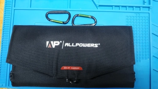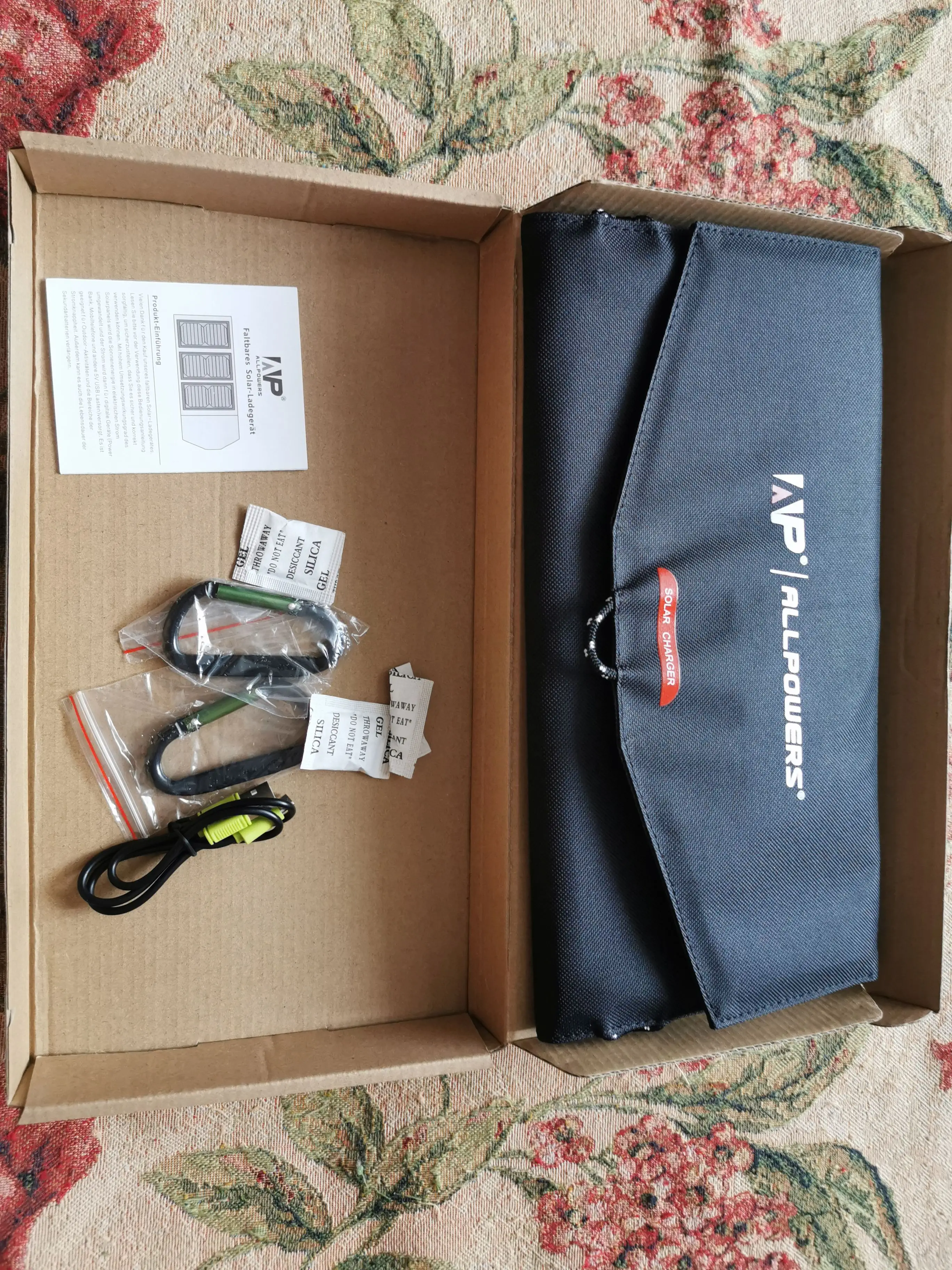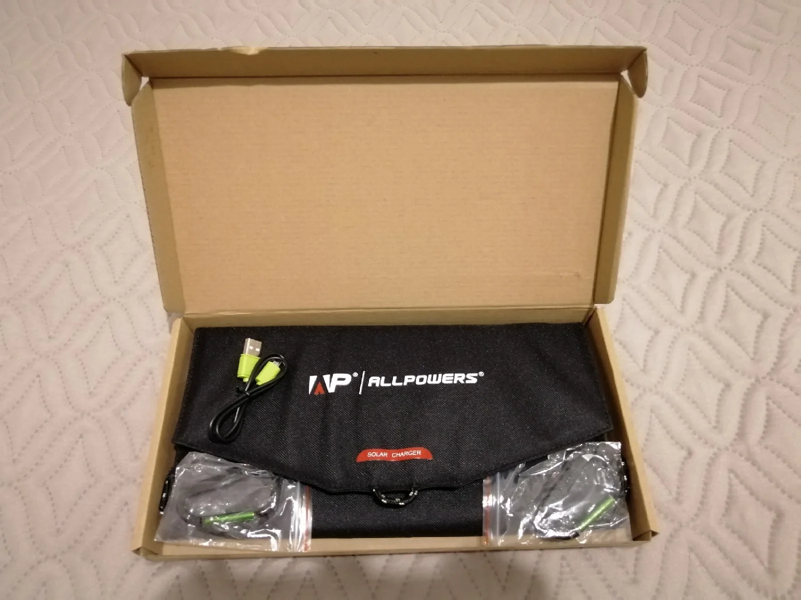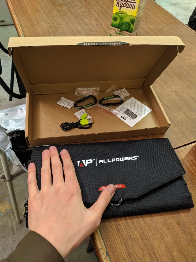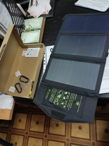 Заказывал со склада в России. Отправили и доставили быстро. Доставка IML. Коробку немного повредили, но панель цела. На весеннем солнышке, через окно, показывает 5,2В и 1,5А. В комплекте 2 карабина и провод на микро юсб.