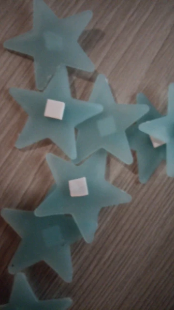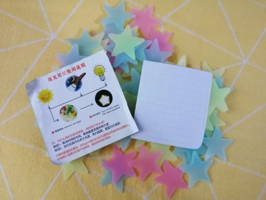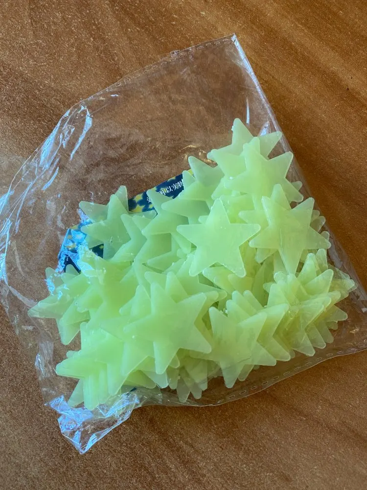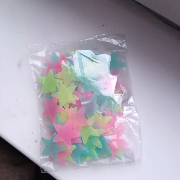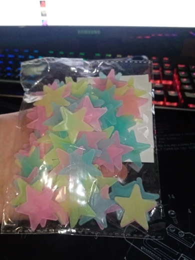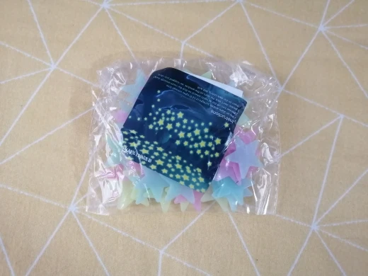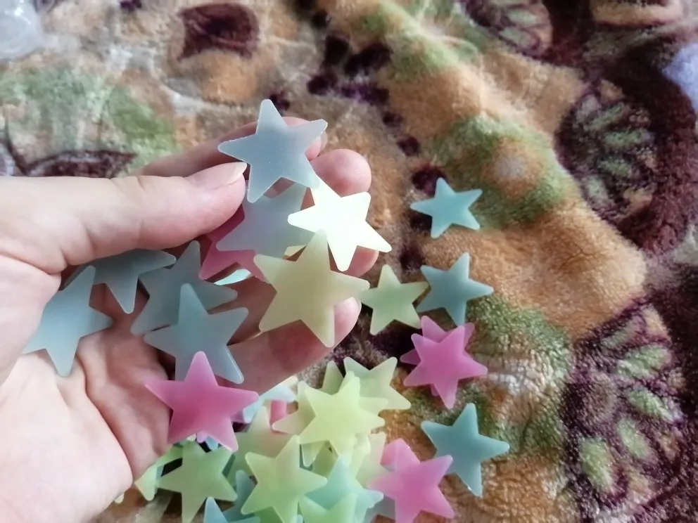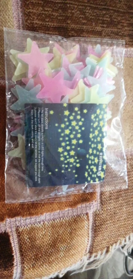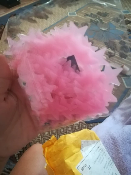 Офигенные звёздочки! Пришли за месяц, для меня это быстро) Их ровно 100. Зелёных 39, голубых 36, розовых 25. Возможно это выбиралось рандомно, но у меня так) Светятся в темноте ярко, даже если недолго на свету были. В комплекте есть маленькие квадратные наклейки для них, их 110) Всем советую)