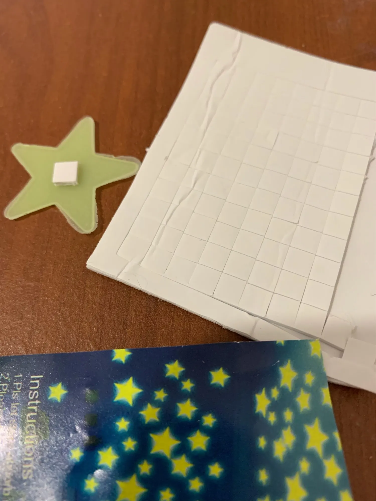 Звёздочки маленькие. отдельно приложен лист самоклейки. Нужно приклеивать на каждую звезду по маленькому квадратику. Звёздочки светиться в темноте, но не ярко слабенько совсем. Ну, а чего ожидать? это не лампочки..хочется, ярко- поможет ночник или проектор звёздного неба..