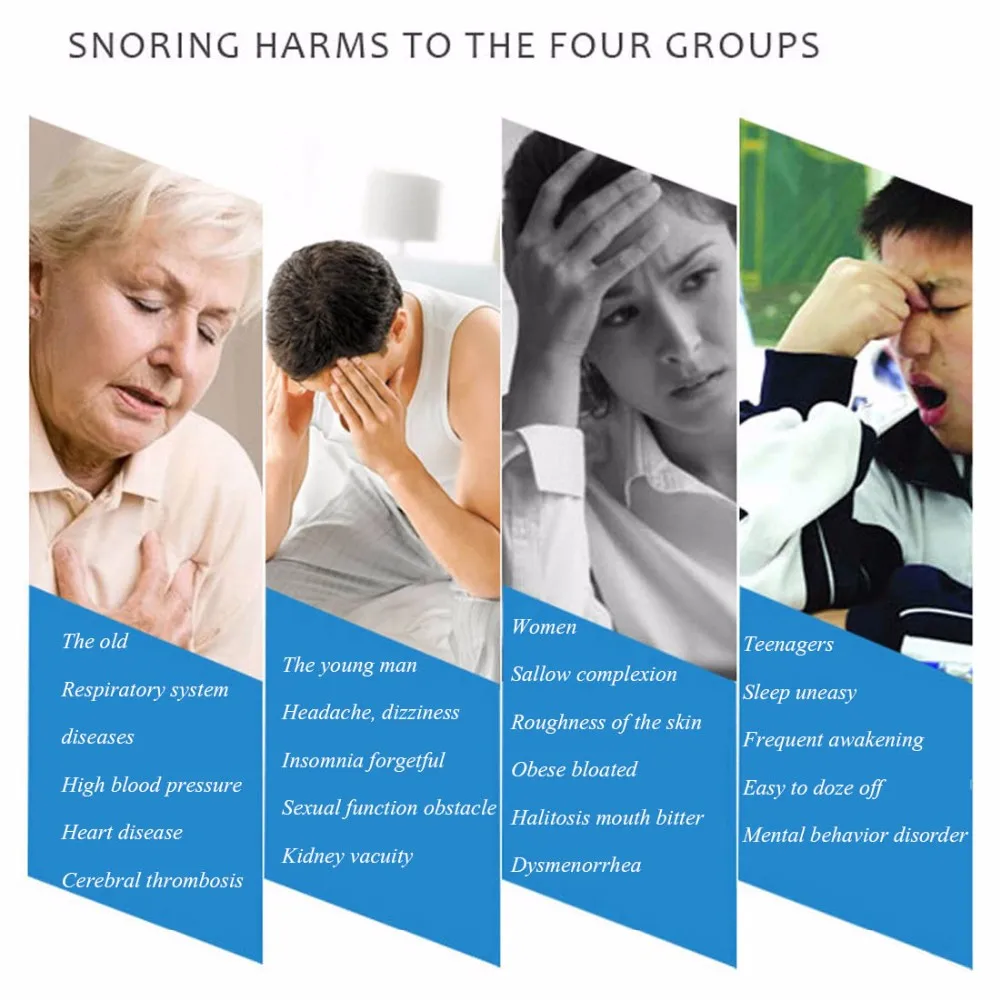 Ремень храпа работает для людей, которые хранит открытым ртом. Помогает при храпе, апноэ во время сна, шлифовке зубов, синдроме и боли TMJ путем правильного позиционирования вашей челюсти. Некоторые общие эффекты апноэ во время сна при отсутствии лечения: