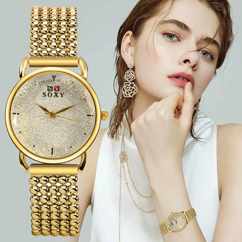 Роскошные золотые часы, женские кварцевые часы SOXY, женская модель, браслет из нержавеющей стали, наручные часы, женские часы, montre