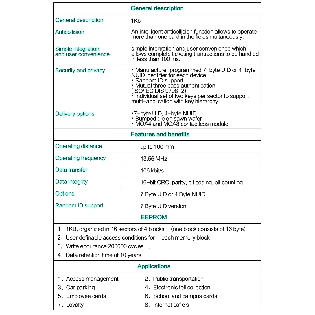 EEPROM* 1 кбит, в 16 отраслях, в каждом районе два паролей* Определяемые пользователем условия доступа для каждого блока памяти* Хранение данных в течение 10 лет.* Запись выносливости 100 000 цикловОсобенности* Бесконтактная передача данных и питания (без батареи)* Рабочее расстояние: до 100 мм (в зависимости от геометрии антенны)* Рабочая частота: 13,56 МГц* Передача данных: 106 кбит/с* Целостность данных: 16 бит CRC, паритет, бит кодирования бит подсчета* Антиколлизия* Типичная транзакция: <100 мс (включая управление резервным копированием)Безопасность* Набор индивидуальных ключей в каждом сегменте (в каждом приложении) для поддержки нескольких приложений с ключевой иерархией* Уникальный серийный номер для каждого устройства* Транспортный ключ защищает доступ к EEPROM при доставке чипаКлючевые особенности• Размеры: 86x54 мм• Толщина: 0,88 мм• Материал: ПВХ• Время хранения данных: минимум 10 лет• Рабочая температура: от-20 до + 60 °C• Температура хранения: от-20 до + 65 °CКлючевые приложения* Общественный транспорт* Контроль доступа* Оформление билетов на события* Игры и идентичность