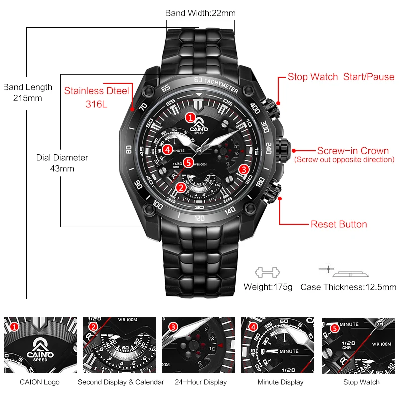 CAINO Для мужчин спортивные часы хронограф Дата 100 м Водонепроница...