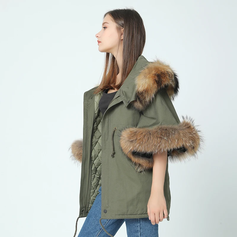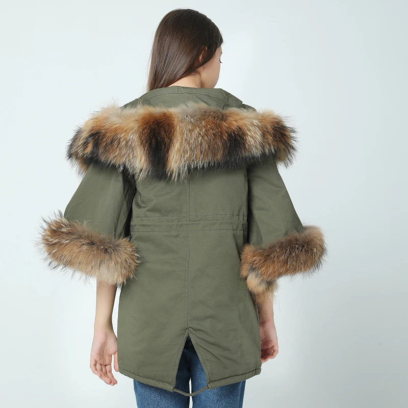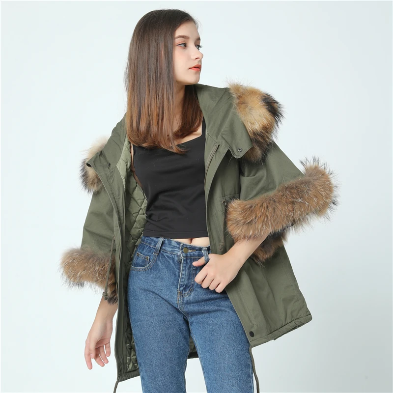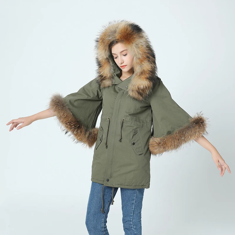 2021 новая зимняя куртка пальто Женская парка осень зима енот большой меховой воротник с капюшоном армейский зеленый Повседневный плащ с расклешенными рукавами