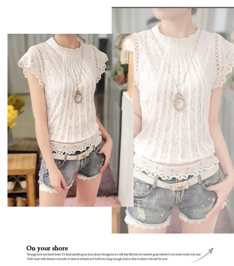 2018 Женская белая кружевная блузка с коротким рукавом с воротником...