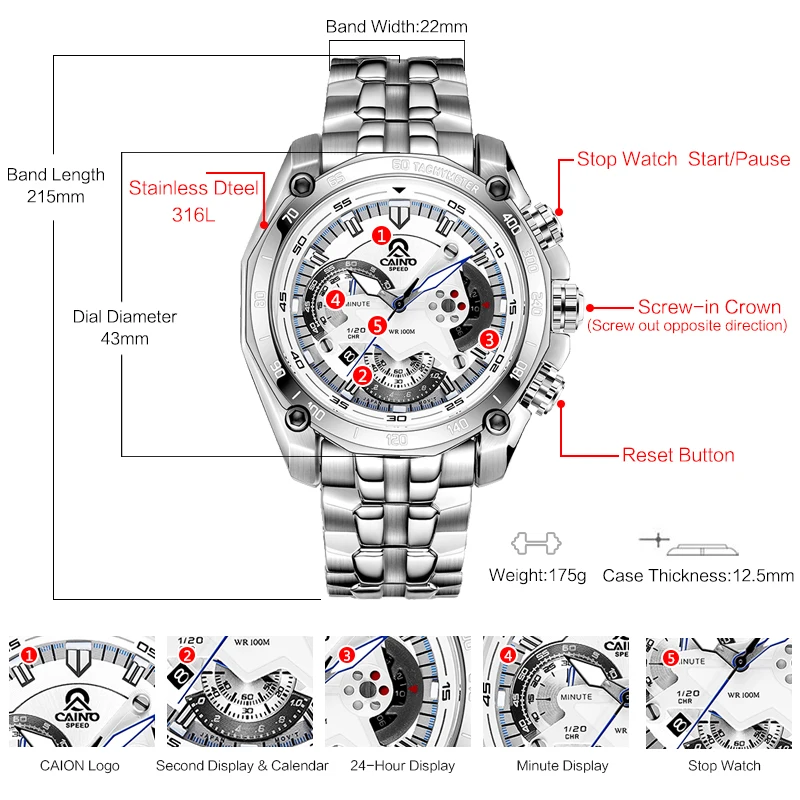 CAINO Для мужчин спортивные часы хронограф Дата 100 м Водонепроница...