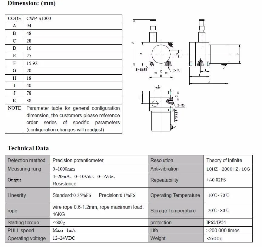 CWP-S1000mm, аналоговый выходной ход, линейный струнный потенциометр, кабель, преобразователь, измеряющий длину провода
